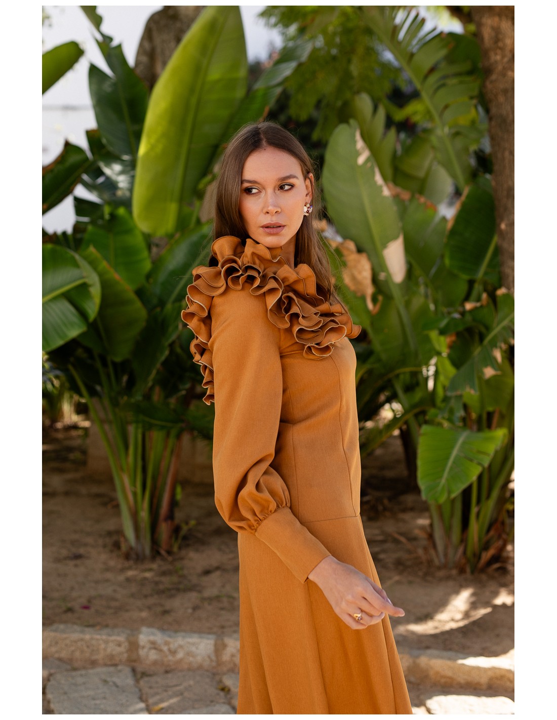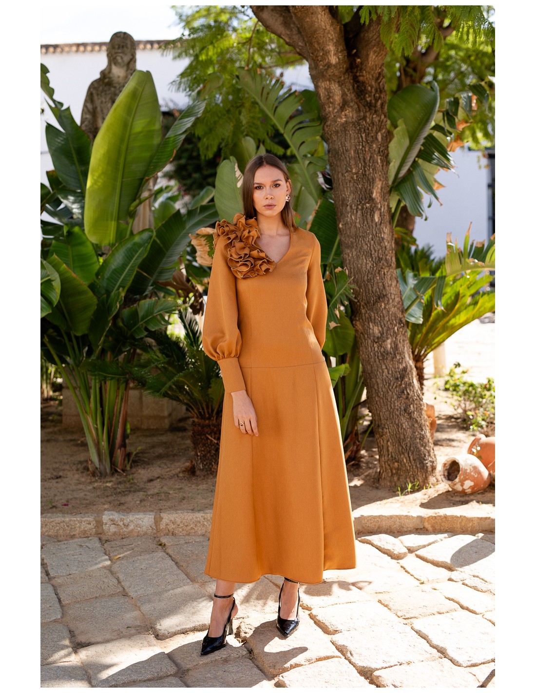 Este vestido midi con volante en tono ocre destaca por su elegancia y su silueta asimétrica, ideal para lucir en eventos especiales. El volante situado en el hombro aporta un efecto chic y sofisticado, creando un diseño moderno y favorecedor. Su color ocre, cálido y terroso, aporta personalidad y un toque distintivo que lo convierte en una prenda perfecta para ocasiones formales tanto de día como de noche.