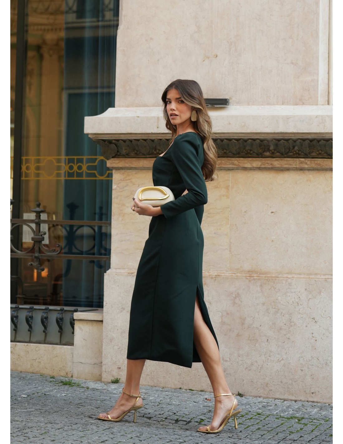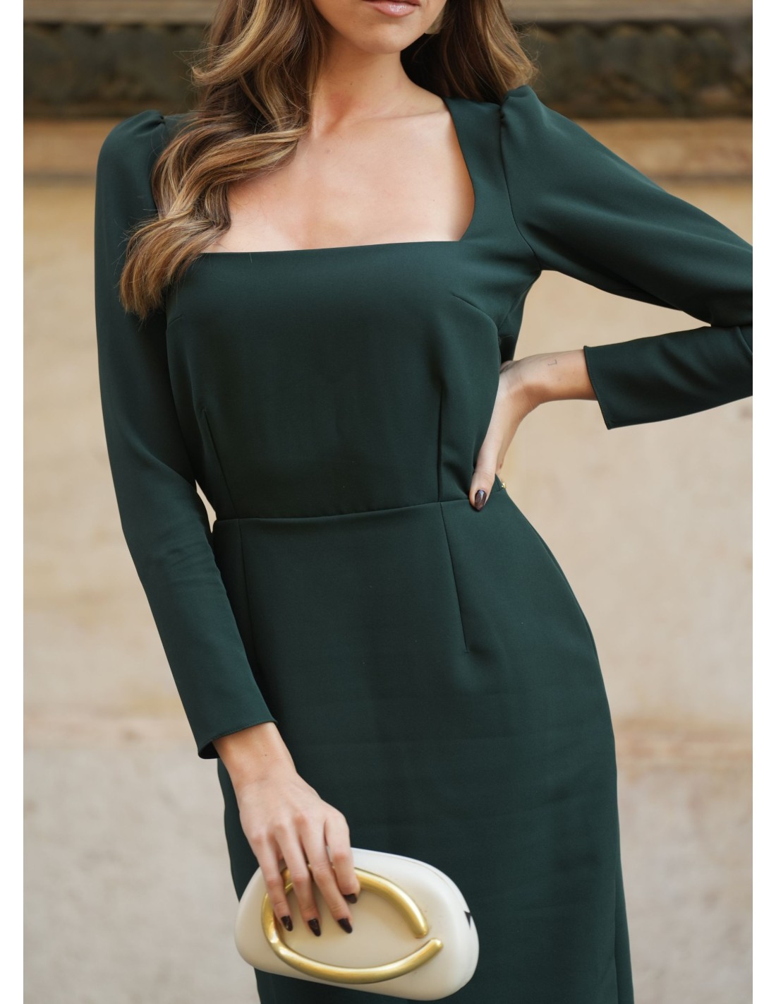 Vestido midi verde oscuro con escote cuadrado y manga larga elegante