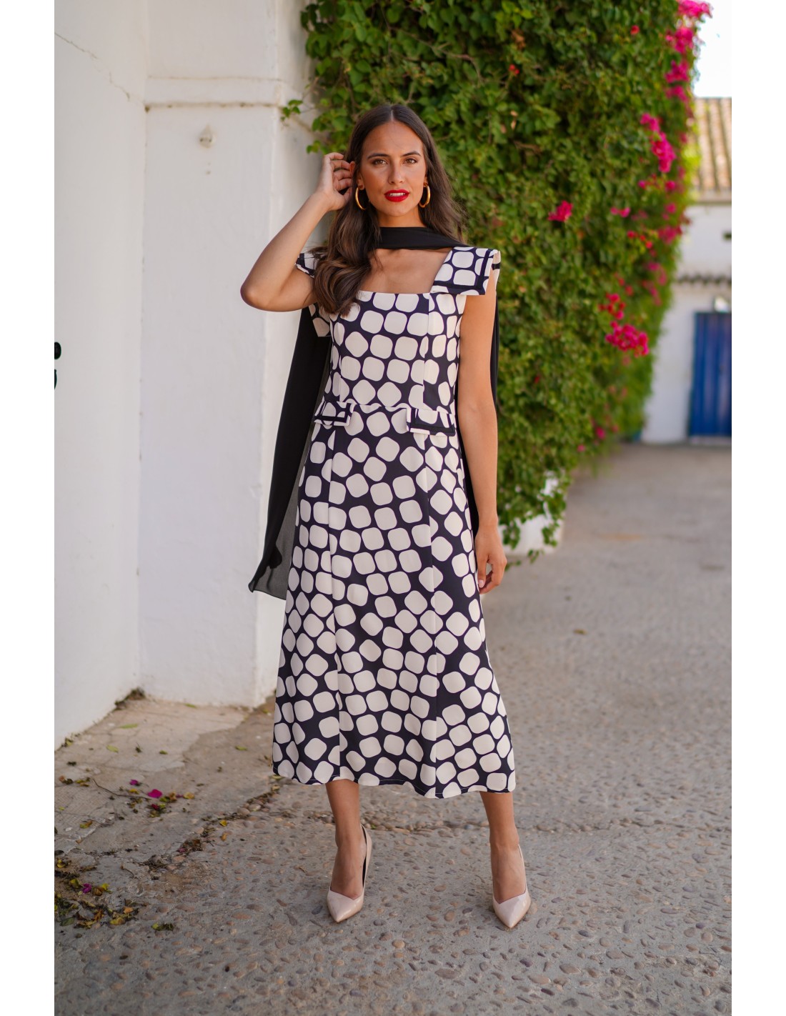 Un diseño especial para eventos de primavera. Este vestido midi está confeccionado en punto con un estampado de lunares en tonos blanco y negro con escote cuadrado y tirantes. Femenino y elegante para todo tipo de eventos, tanto si eres mama de comunión, bautizo o eventos de dia. Incorpora un chal de gasa en color negro para el cuello. Este vestido te hará ser una invitada perfecta.