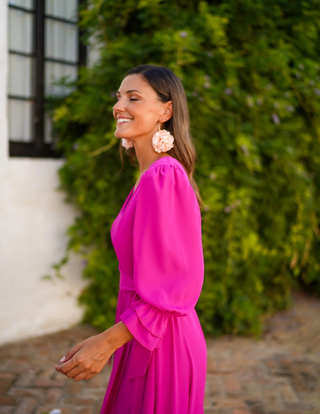 Vestido midi color buganvilla en tejido fluido para invitada