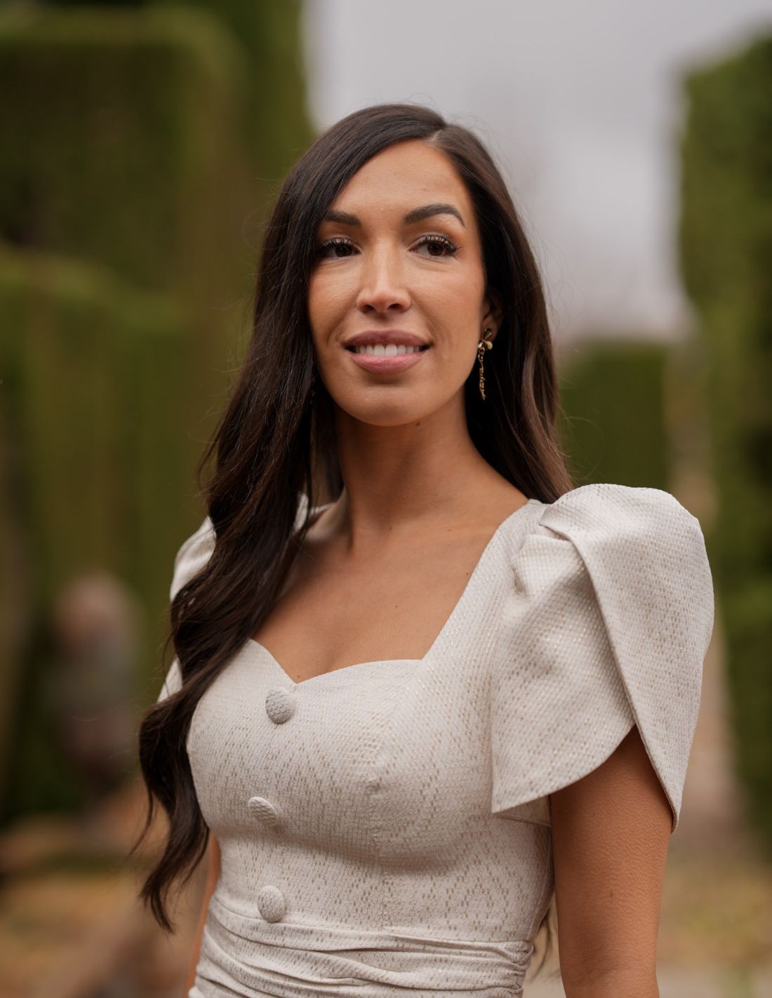 Vestido midi elegante en brocado beige con detalles dorados, perfecto para ceremonias civiles, mamás de bautizo o comunión.