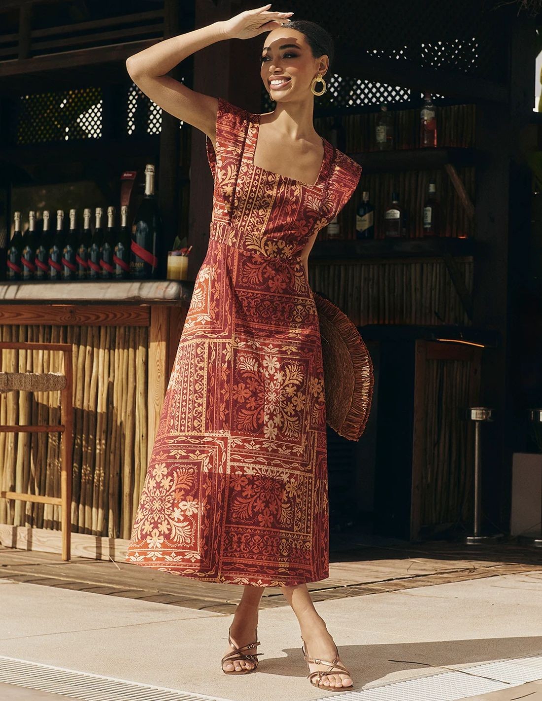 Este vestido de invitada midi con estampado geométrico en tonos tierra, confeccionado en un tejido con estructura, destaca por su patronaje definido y su aire artesanal sofisticado que lo hace ideal para eventos de día. El diseño se articula en torno a un escote cuadrado muy limpio que se extiende hacia unos tirantes anchos, además cuerpo del vestido se ajusta a la cintura para realzar la figura, así como presenta una apertura en la espalda.