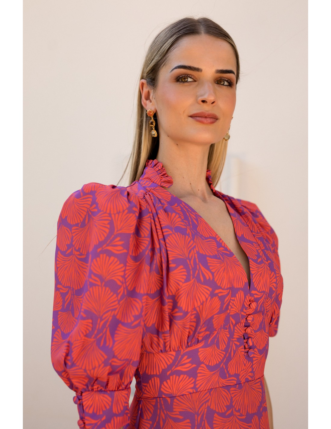 Si buscas un diseño especial para tus eventos de primavera, este vestido midi te va a enamorar. Confeccionado en georgette fluido con estampado en flor en tonos corales y lilas. Incorpora escote en V y mangas cortas abullonadas que acaban en puño y con hombrera marcada, que lo hace super favorecedor. La cintura va ajustada que permite una figura de efecto reloj de arena. Perfecto para bodas, comunión o bautizo.