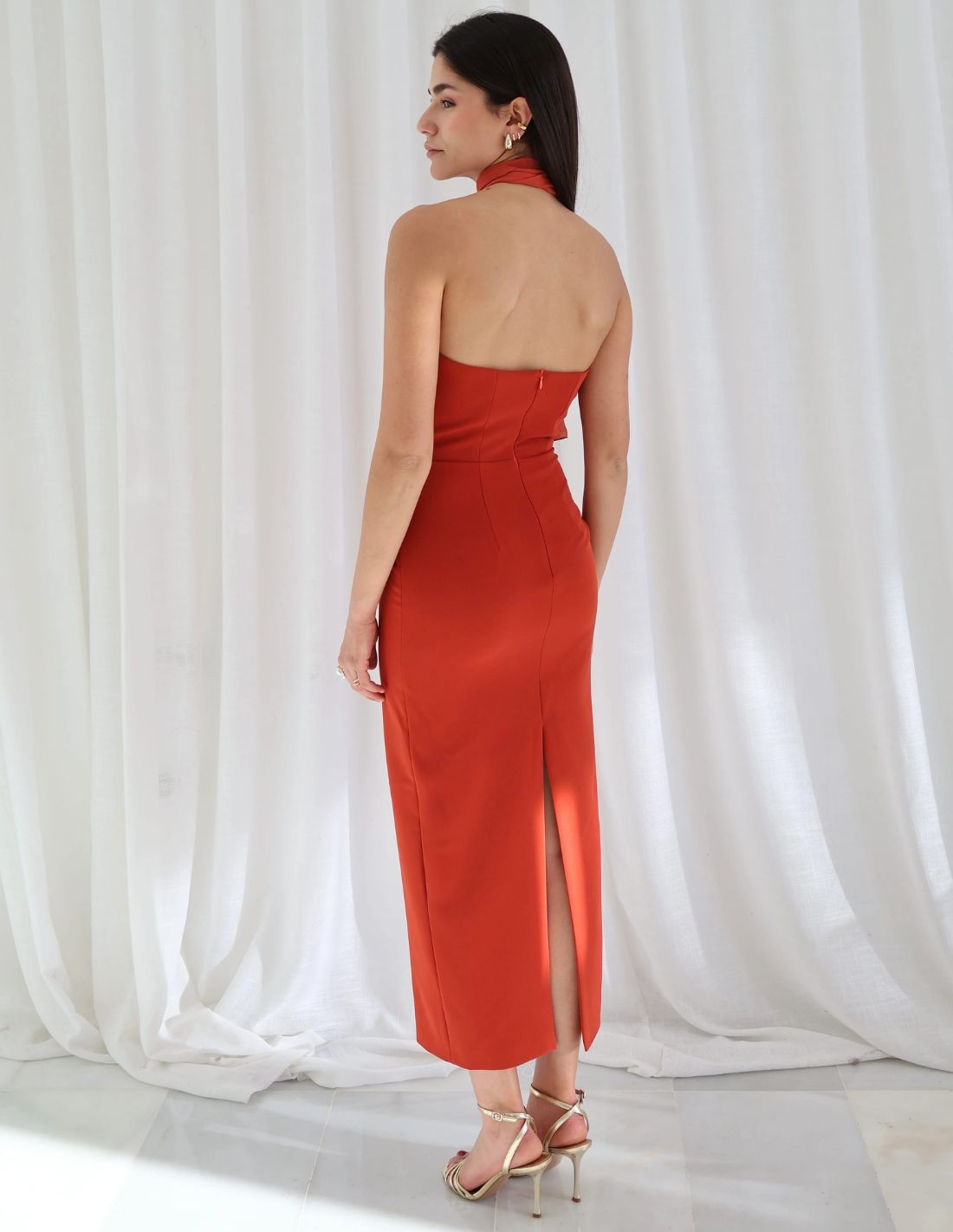 Vestido de invitada midi en crepe con escote halter y detalle de lazo