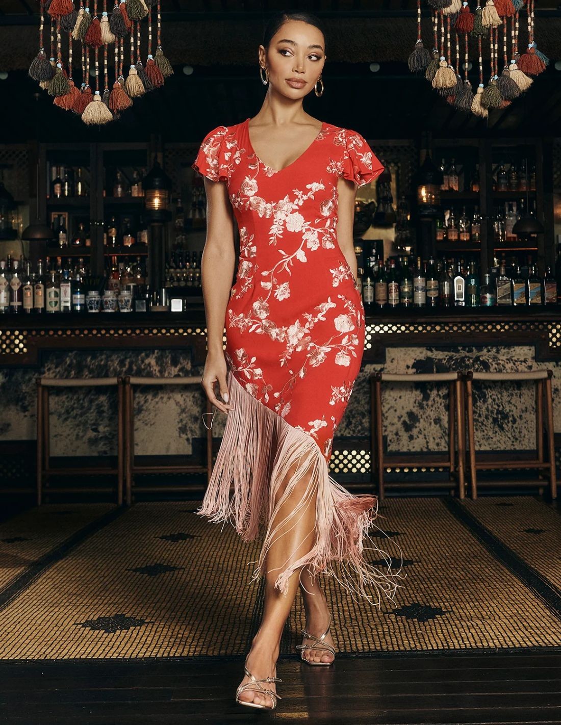 El detalle protagonista es su bajo asimétrico adornado con flecos largos de hilo, que añaden dinamismo al look, perfecto para ocasiones especiales o noches en las que quieras destacar. Combínalo con sandalias finas o con tacones llamativos para elevar aún más tu estilo.