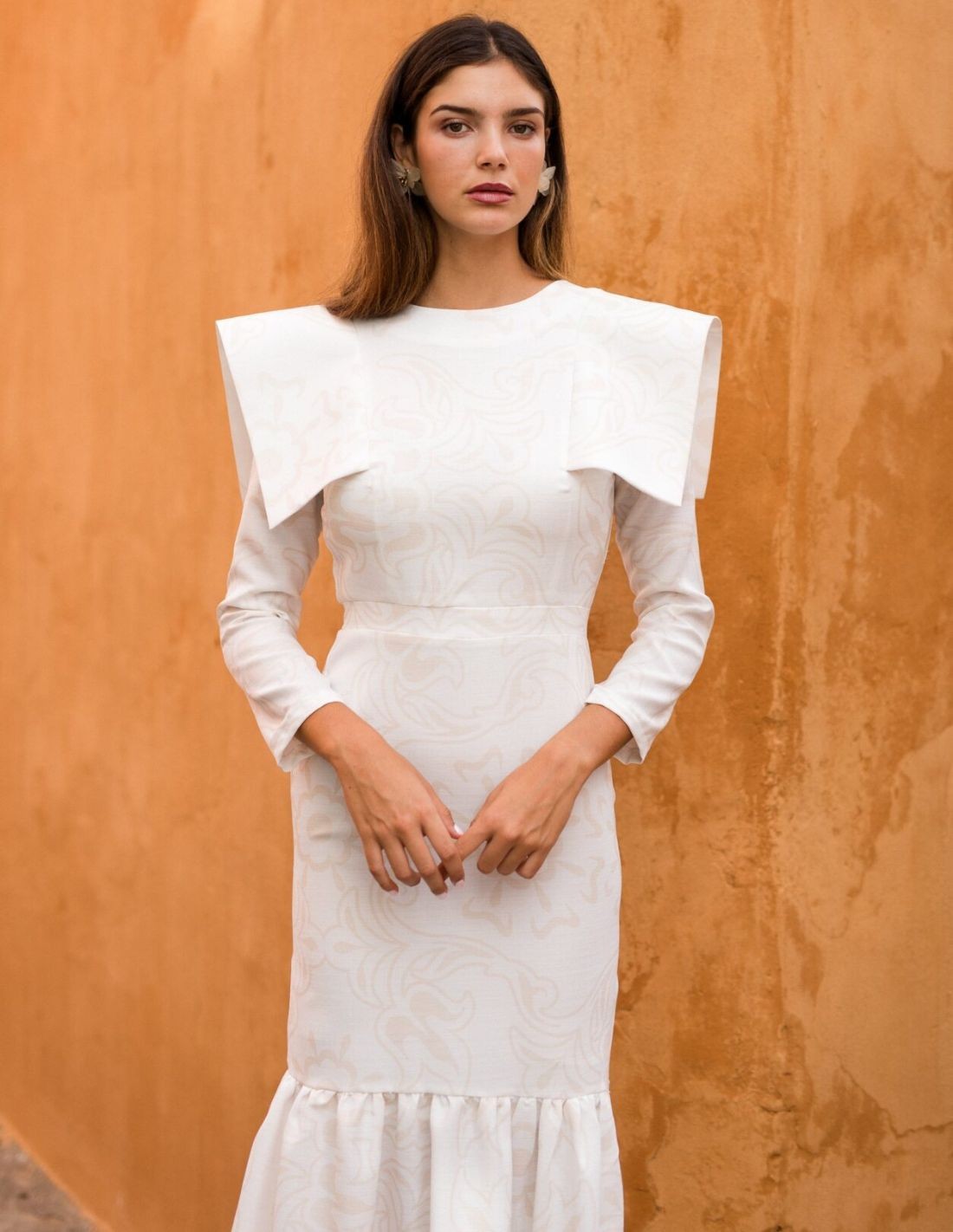 Vestido midi blanco de corte recto con elegante textura tonal y hombros estructurados que aportan un toque sofisticado. El volante en el bajo añade movimiento y feminidad, creando un diseño moderno y refinado ideal para ocasiones especiales.