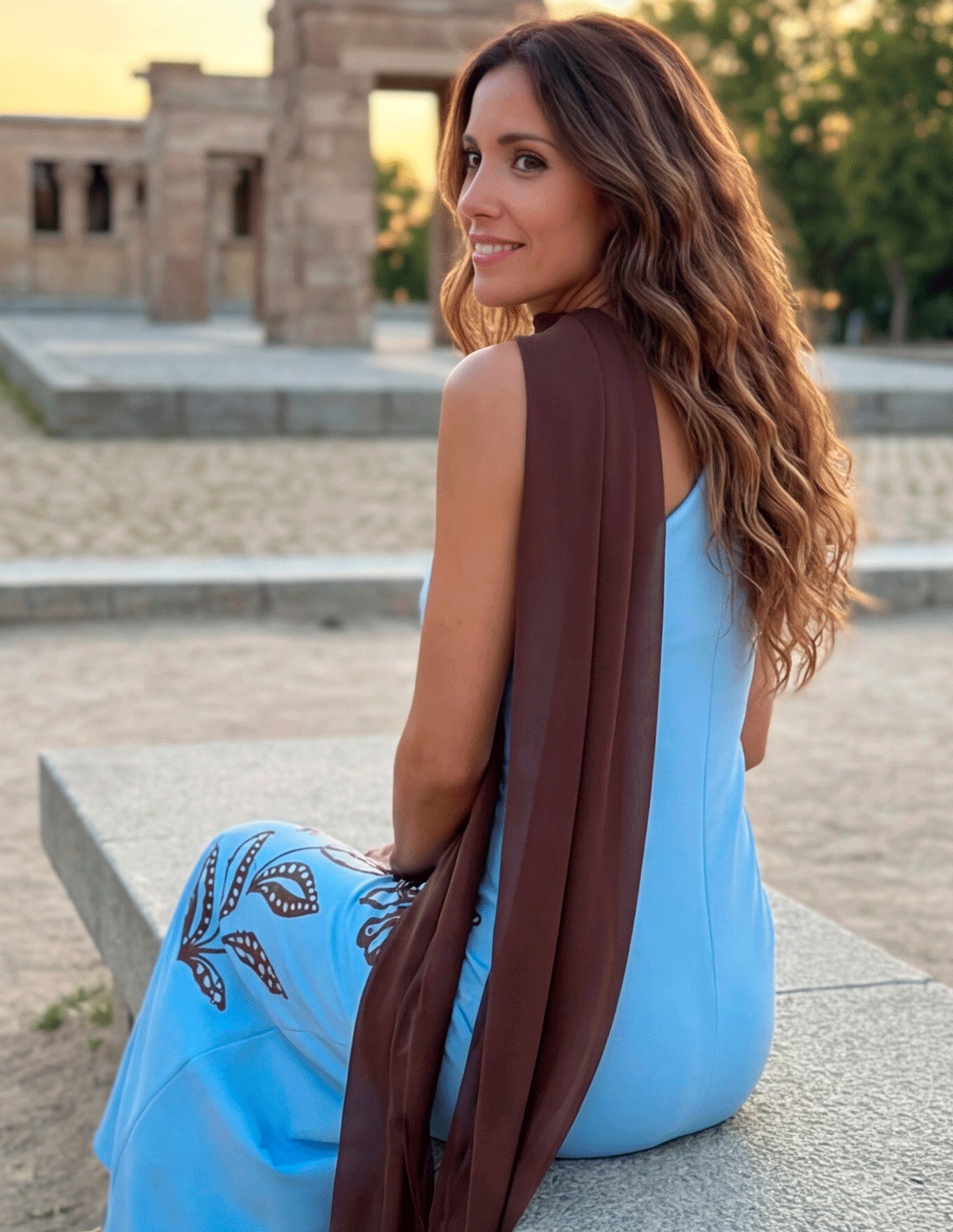 Vestido midi azul con estampado floral en tonos marrones y chal a juego. Un diseño elegante, original y muy favorecedor para eventos especiales.