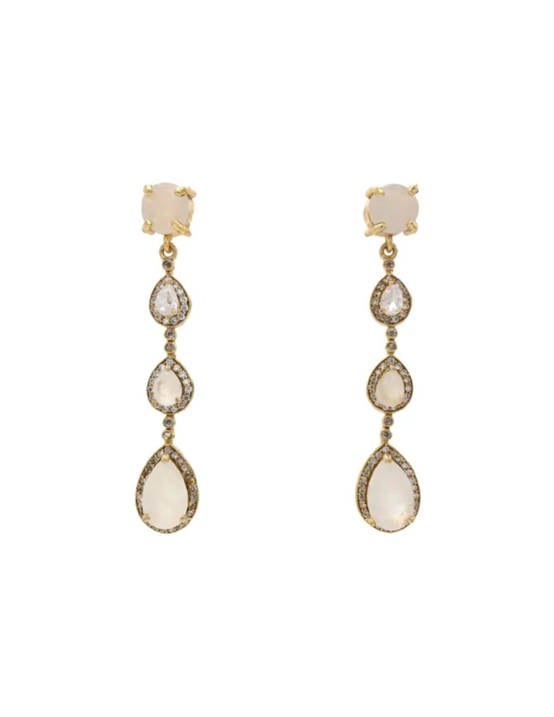 Boucles d'oreilles conçues pour faire briller toute mariée ou invitée lors d'une occasion très spéciale telle qu'un mariage. Composées de trois larmes de pierres facettées et encadrées par un petit fil de petits zircons, elles tombent de manière légère et élégante, allongeant le cou et encadrant le visage. Un choix idéal pour les mariées à la recherche d'un accessoire élégant et subtil.