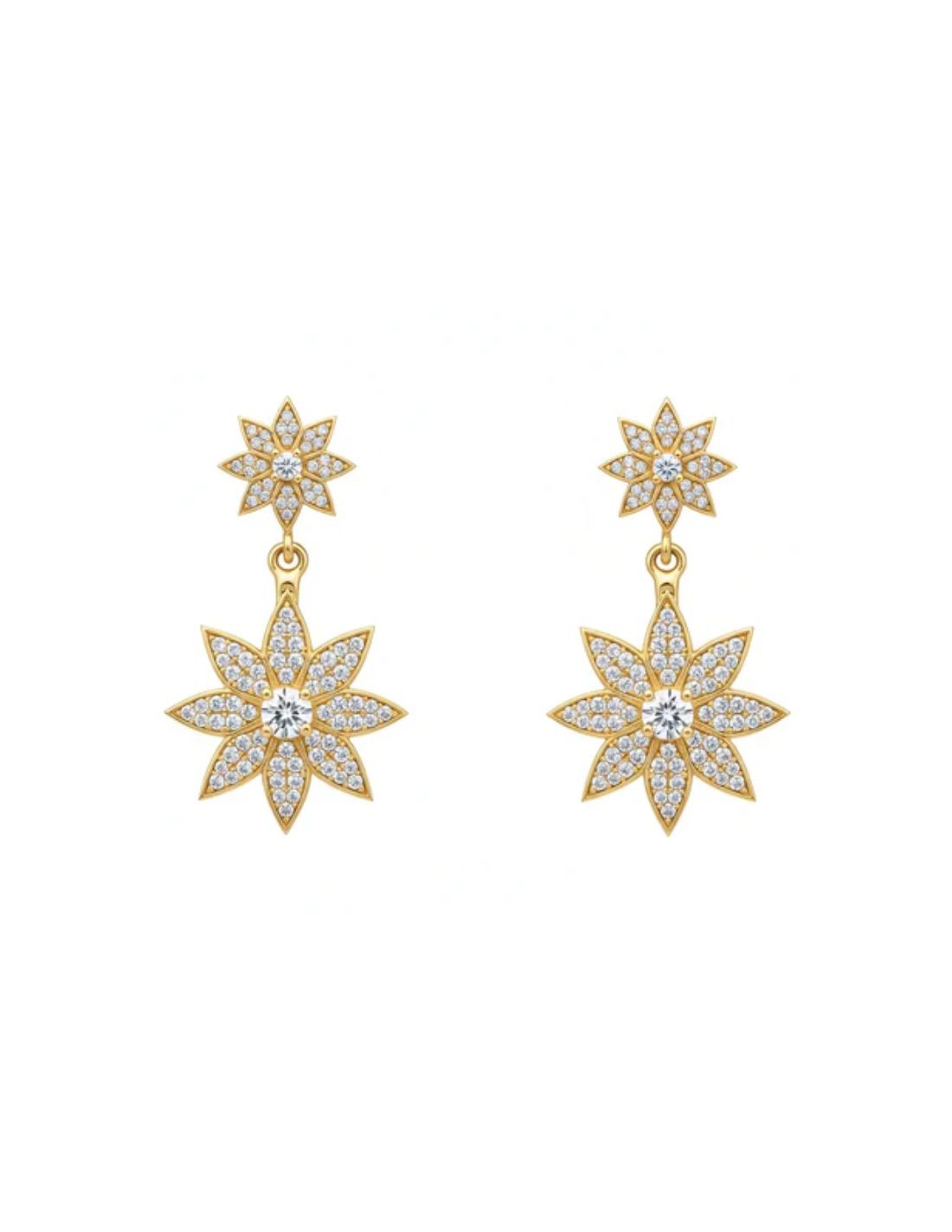 Boucles d'oreilles conçues pour les invitées ou les mariées souhaitant rehausser leur look de manière élégante et subtile, avec une double étoile, une plus petite en haut et une plus grande en bas, toutes deux composées de zircons sertis de pierres précieuses, qui ajoutent une touche de lumière à n'importe quel visage. Idéales pour un événement spécial tel qu'un mariage.