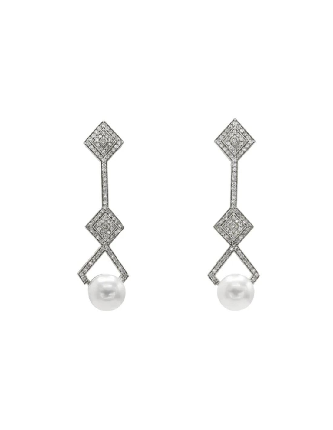 Boucles d'oreilles créées pour éblouir en toute occasion, spécialement conçues pour les mariées. Leur design combine d'élégantes formes géométriques avec des diamants argentés sertis de délicats zircons, culminant dans une perle baroque qui ajoute une touche de sophistication et d'élégance à tout look d'invité ou à toute robe de mariée.