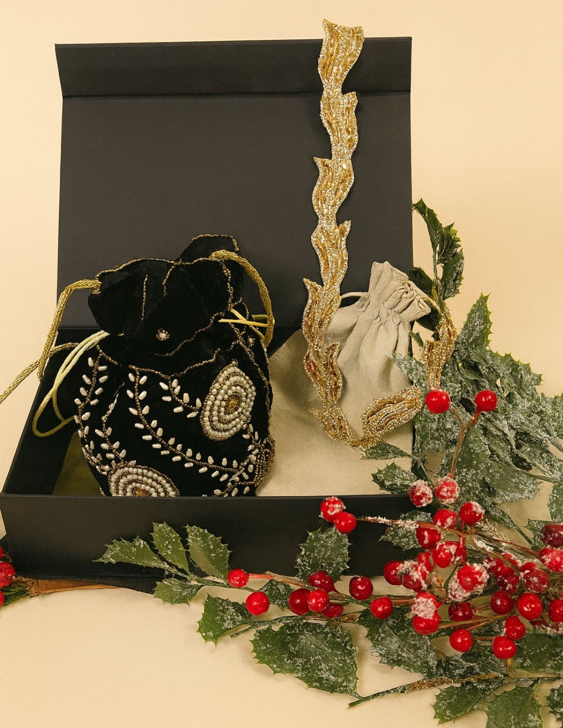 Pour les fêtes de fin d'année, offrez ce coffret avec des accessoires idéaux qui rehausseront un look décontracté ou habillé, notamment : une boîte en velours noir avec fleurs brodées et strass et une ceinture avec strass dorés. Si elle est une personne qui recherche toujours des accessoires pour compléter son look, ce coffret est la meilleure option ! Parfait comme cadeau pour les amis, les partenaires, les sœurs, les mères ? c'est le cadeau idéal !