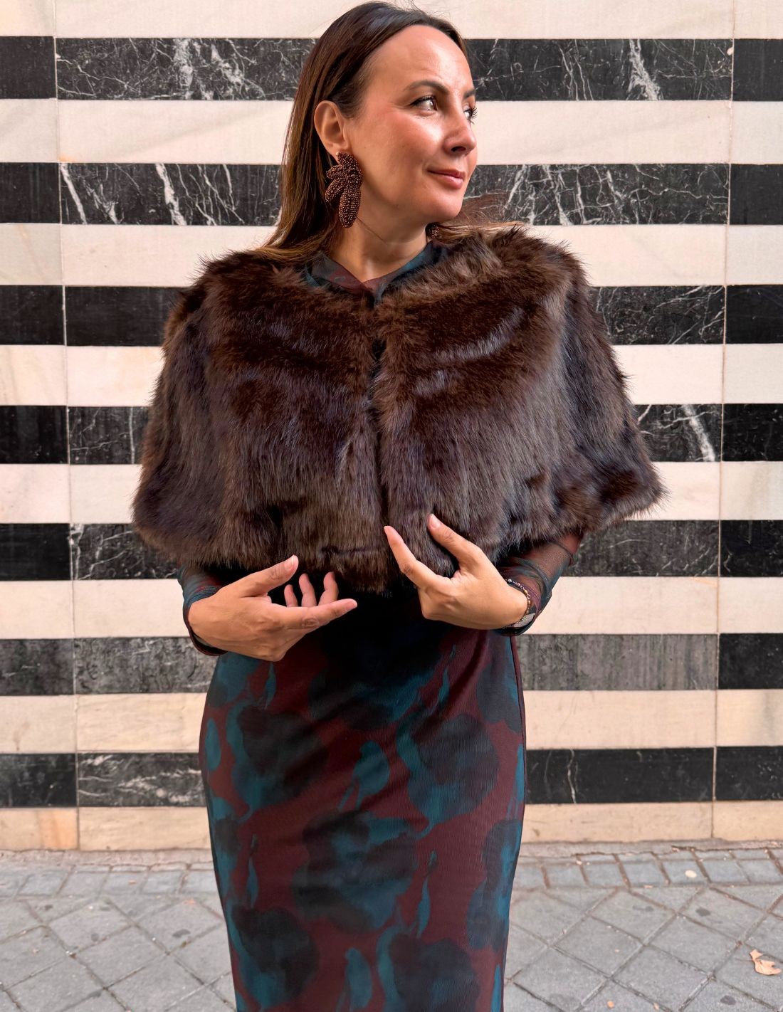 Ajoutez une touche d'élégance à votre look d'invité avec cette cape courte marron foncé, parfaite pour les événements d'automne et d'hiver. Son design structuré et son drapé fluide rehaussent n'importe quelle tenue, ce qui en fait le complément idéal des robes midi ou des ensembles deux pièces. La couleur marron foncé ajoute de la profondeur et de la sophistication, offrant une alternative moderne et polyvalente aux tons classiques. Fabriqué dans un tissu doux et de haute qualité.