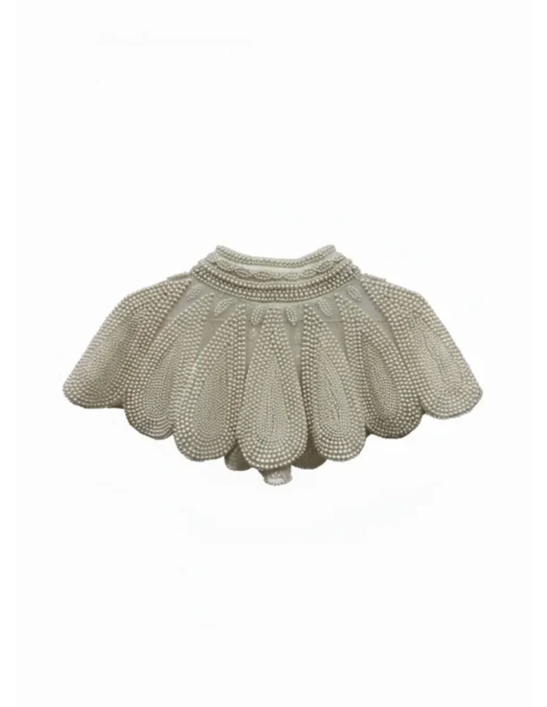 Ce collier bijou est une pièce exclusive qui rehausse toutes les tenues d'une touche d'élégance et de distinction. Son design structuré et ses finitions soignées mettent en valeur la silhouette, en lui apportant sophistication et équilibre visuel. Orné de délicates perles disposées harmonieusement, il crée un effet lumineux et doux, idéal pour compléter une robe de mariée ou un look de cérémonie.