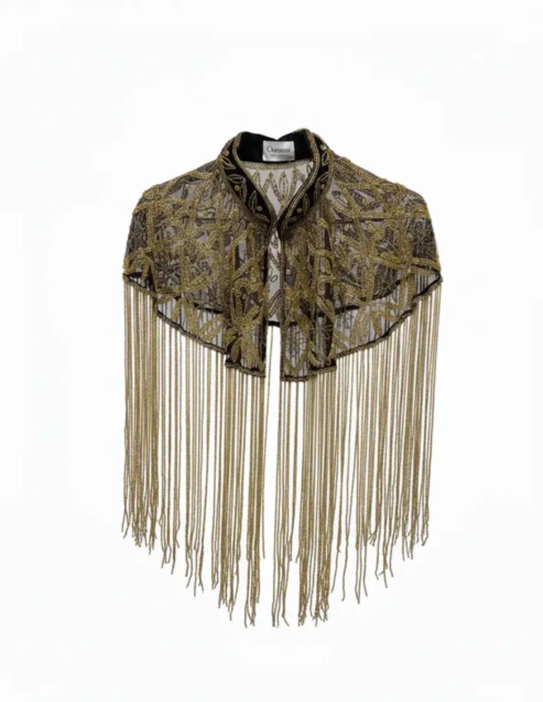 Cape ornée de bijoux et de broderies géométriques dorées et noires pour les occasions spéciales