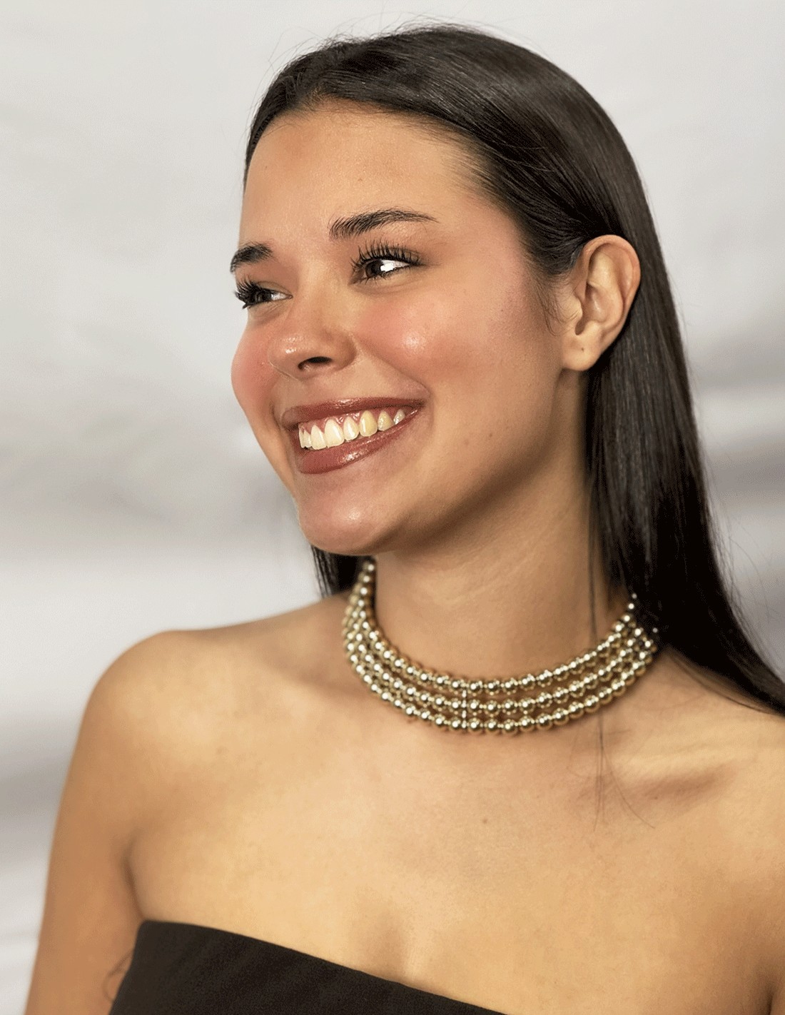 Brillez de mille feux avec ce tour de cou doré à trois rangs de perles, une pièce polyvalente et sophistiquée qui rehausse n'importe quel look. Son design délicat allie l'élégance classique à une touche de modernité, parfaite pour les événements spéciaux comme pour la vie de tous les jours.