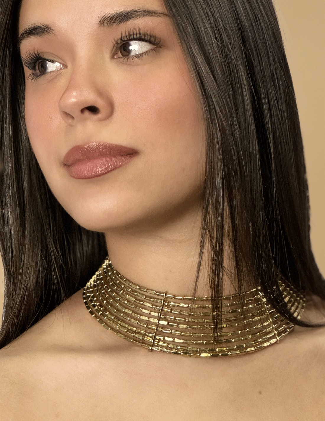 Cette saison, vos looks seront les meilleurs avec ce large tour de cou fait à la main avec des strass dorés. Parfait à porter avec des tailleurs ou des robes avec un décolleté pour le mettre en valeur. Très flatteur car c'est une pièce qui apporte beaucoup de lumière au visage. Un accessoire indispensable pour les événements et les tenues décontractées. C'est une pièce intemporelle et polyvalente, pour celles d'entre vous qui recherchent l'élégance sans être exubérantes.