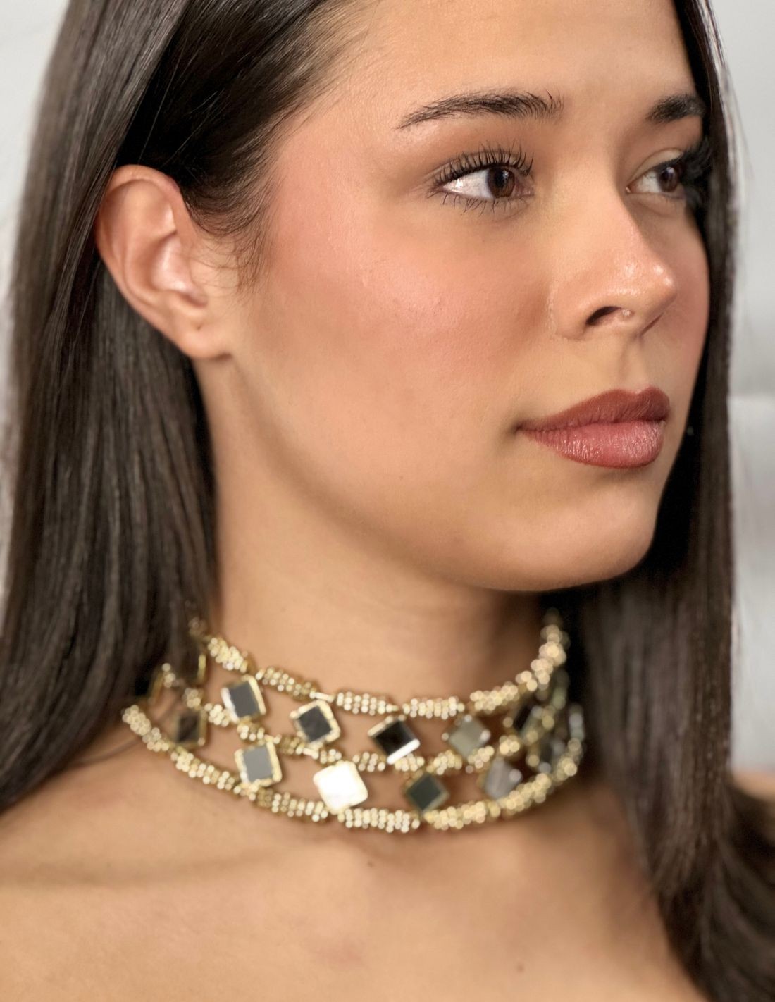 Ajoutez une touche d'élégance et de style à votre look avec notre tour de cou double largeur en miroir, une pièce idéale pour rehausser n'importe quelle tenue ou ensemble à son plus haut niveau. Le design à double bretelle souligne élégamment le décolleté, tandis que les petits miroirs reflètent des éclats subtils pour un look original et sophistiqué. Parfait pour combiner avec des tenues simples et des tissus unis, idéal pour toutes les saisons, comme cadeau ou même pour combiner avec les looks de Noël. Léger, réglable et plein de personnalité, ce tour de cou est l'accessoire idéal pour celles qui aiment se distinguer avec style.