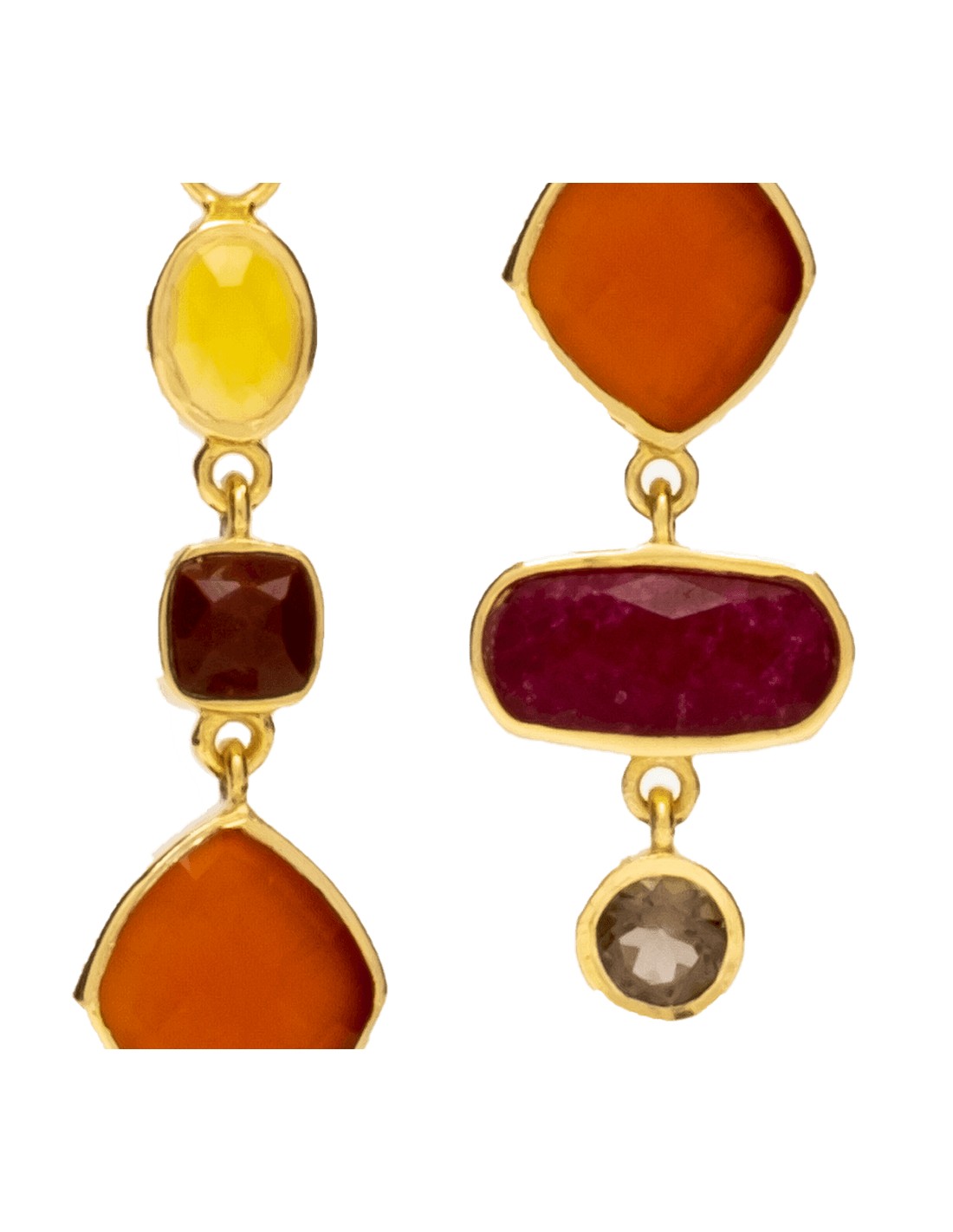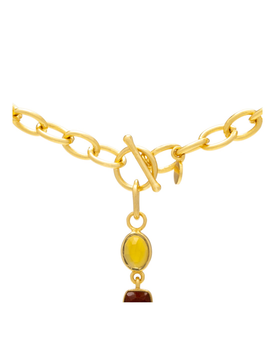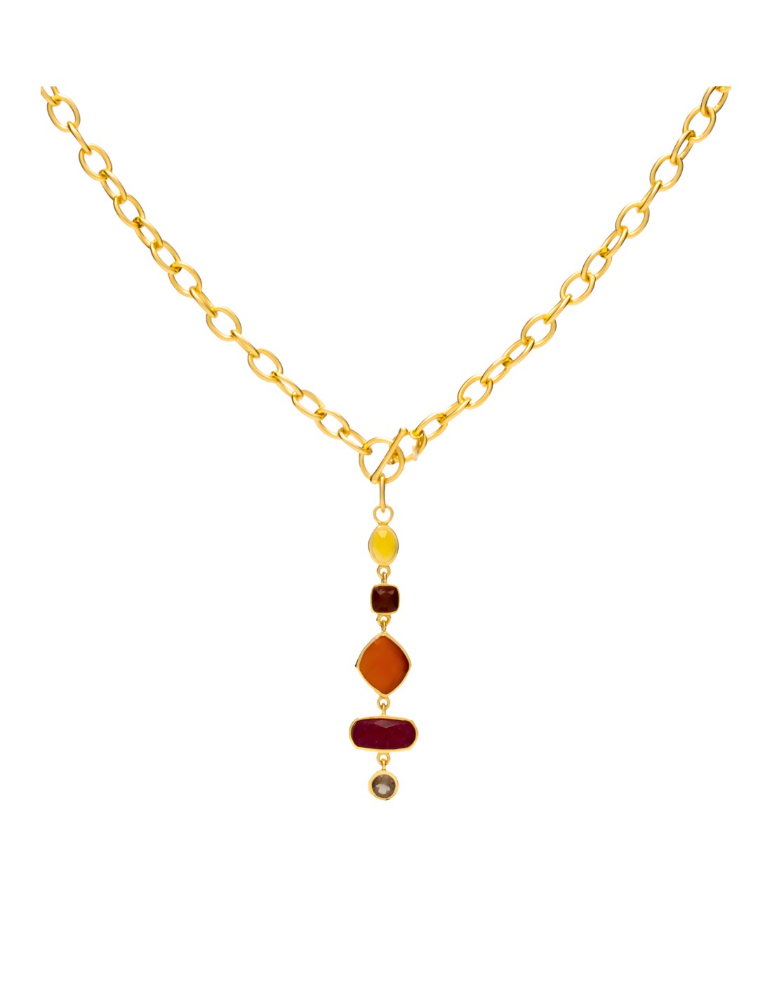 Collier à maillons en plaqué or, au design moderne, avec un fermoir frontal pour une touche distinctive. Son pendentif combine des pierres dans des tons chauds de jaune, d'ambre et de rouge, créant un style élégant et accrocheur.