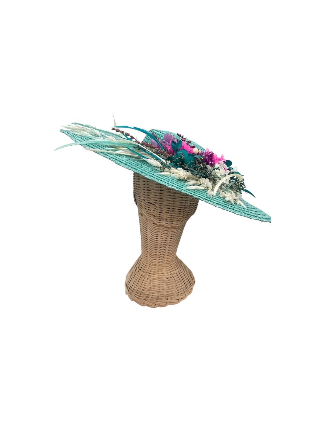 Si vous avez un événement spécial à venir et que vous souhaitez compléter votre look avec un accessoire qui fera la différence, ce chapeau d'invité pourrait être votre choix idéal. Une pamela faite à la main en vert d'eau, avec des ornements floraux de différentes couleurs sur le côté et un bandeau pour la maintenir en place. Idéal pour rehausser votre look au maximum, vous brillerez à coup sûr.