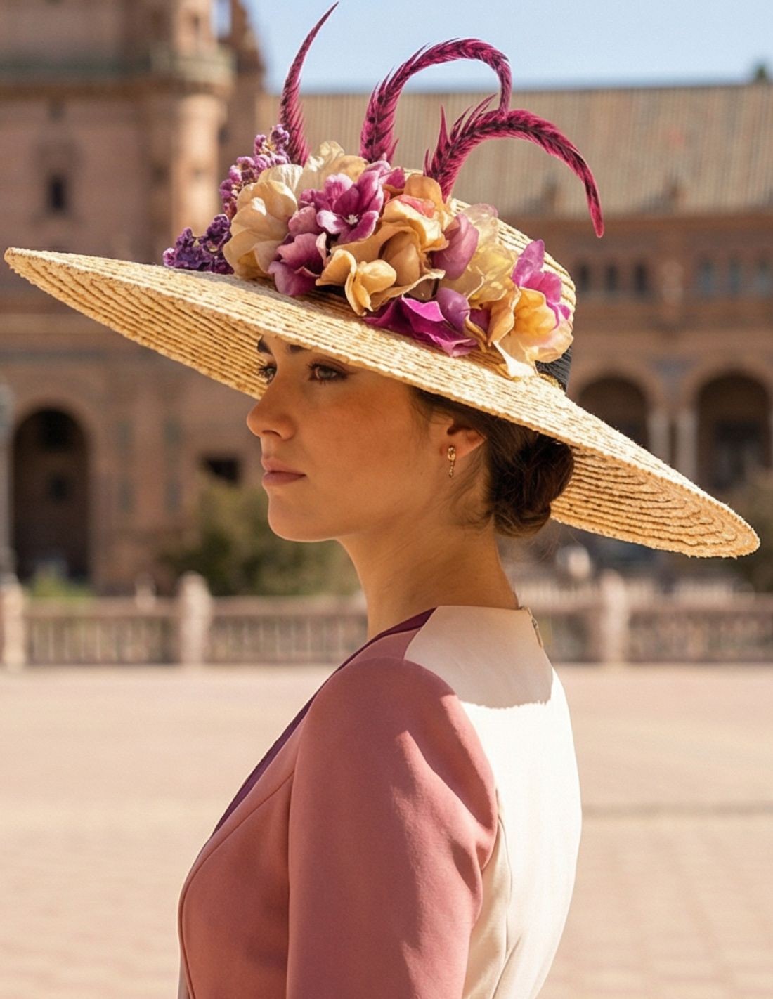 Pamela en raphia naturel avec fleurs et plumes couleur bougainvillée, élégante et sophistiquée, idéale pour les invités lors d'événements diurnes.