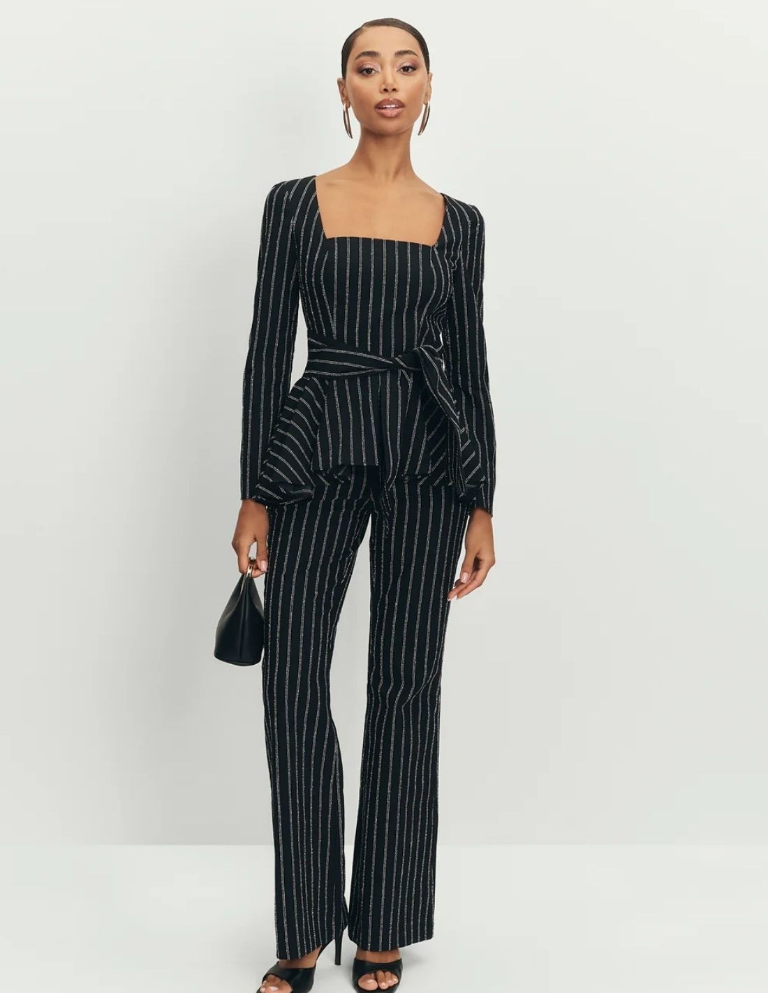 Ce pantalon noir à rayures redéfinit l'élégance grâce à sa silhouette profilée et à son luxueux tissu texturé et gaufré. La taille haute met en valeur la silhouette, tandis que la coupe bootcut légèrement évasée allonge visuellement les jambes pour plus de sophistication et d'équilibre.
