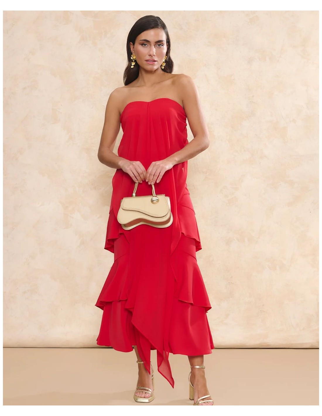 Jupe midi d'invité en crêpe rouge avec volants superposés