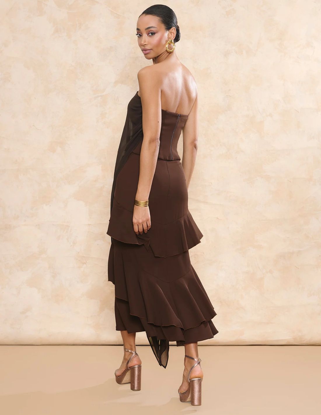 Jupe midi d'invité en crêpe marron avec volants superposés