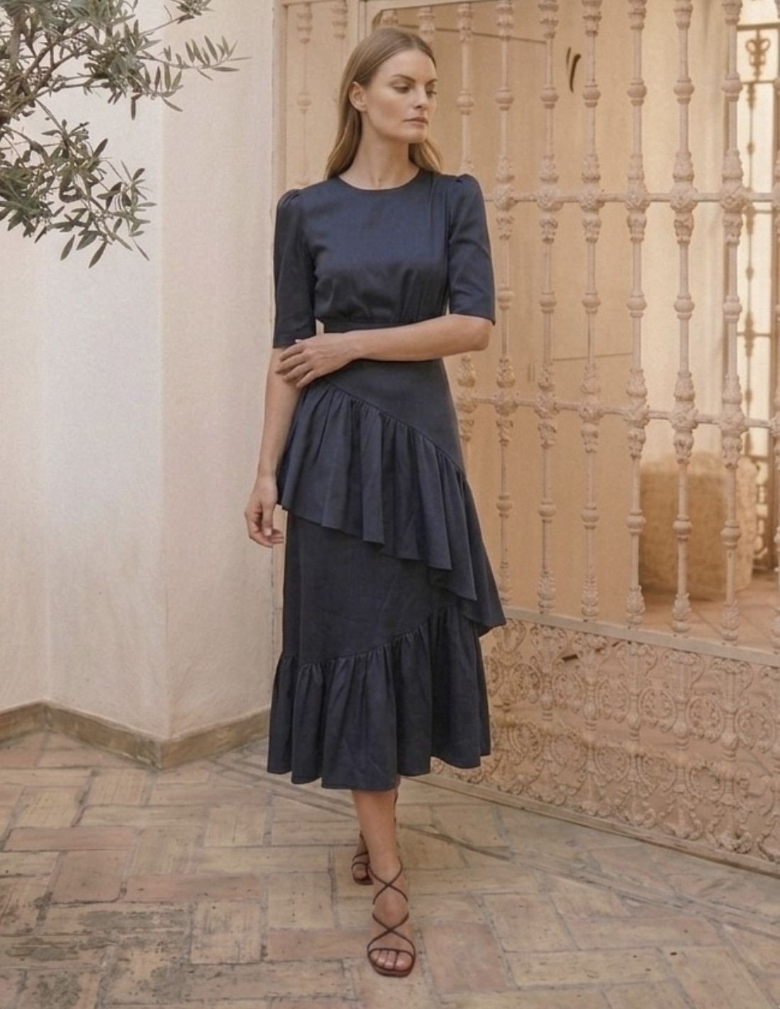 Élevez votre style avec cette jupe midi sophistiquée en taffetas dans une élégante teinte bleu foncé. Les volants délicats apportent mouvement et féminité, tandis que l'ourlet asymétrique apporte une touche contemporaine et distinctive. Confectionnée en taffetas léger, elle offre une structure subtile qui met en valeur la silhouette sans compromettre le confort. Idéale pour les occasions spéciales ou pour donner une touche raffinée aux looks de tous les jours, cette jupe s'associe parfaitement avec des blouses ajustées ou des tops minimalistes.