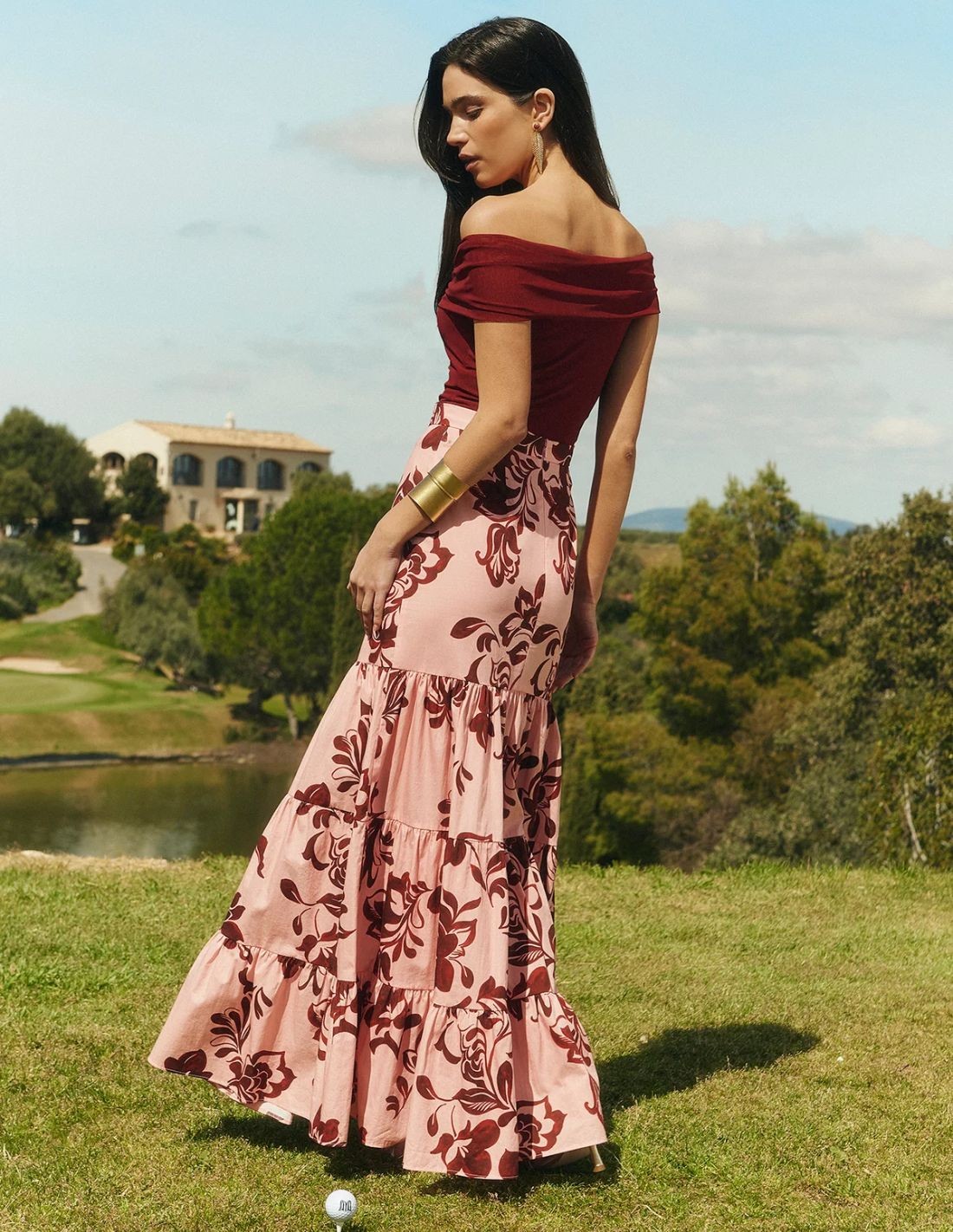 Jupe longue à l' imprimé floral délicat dans les tons de rose. Sa silhouette fluide, avec ses volants en cascade, apporte mouvement et légèreté, ce qui en fait une pièce idéale pour les événements spéciaux ou les looks d'invités. Réalisée dans un tissu doux et léger, elle épouse confortablement la silhouette, en soulignant la taille et en affinant la silhouette. Le contraste entre le fond rose et les fleurs dans les tons de terre ajoute de l'élégance au modèle.