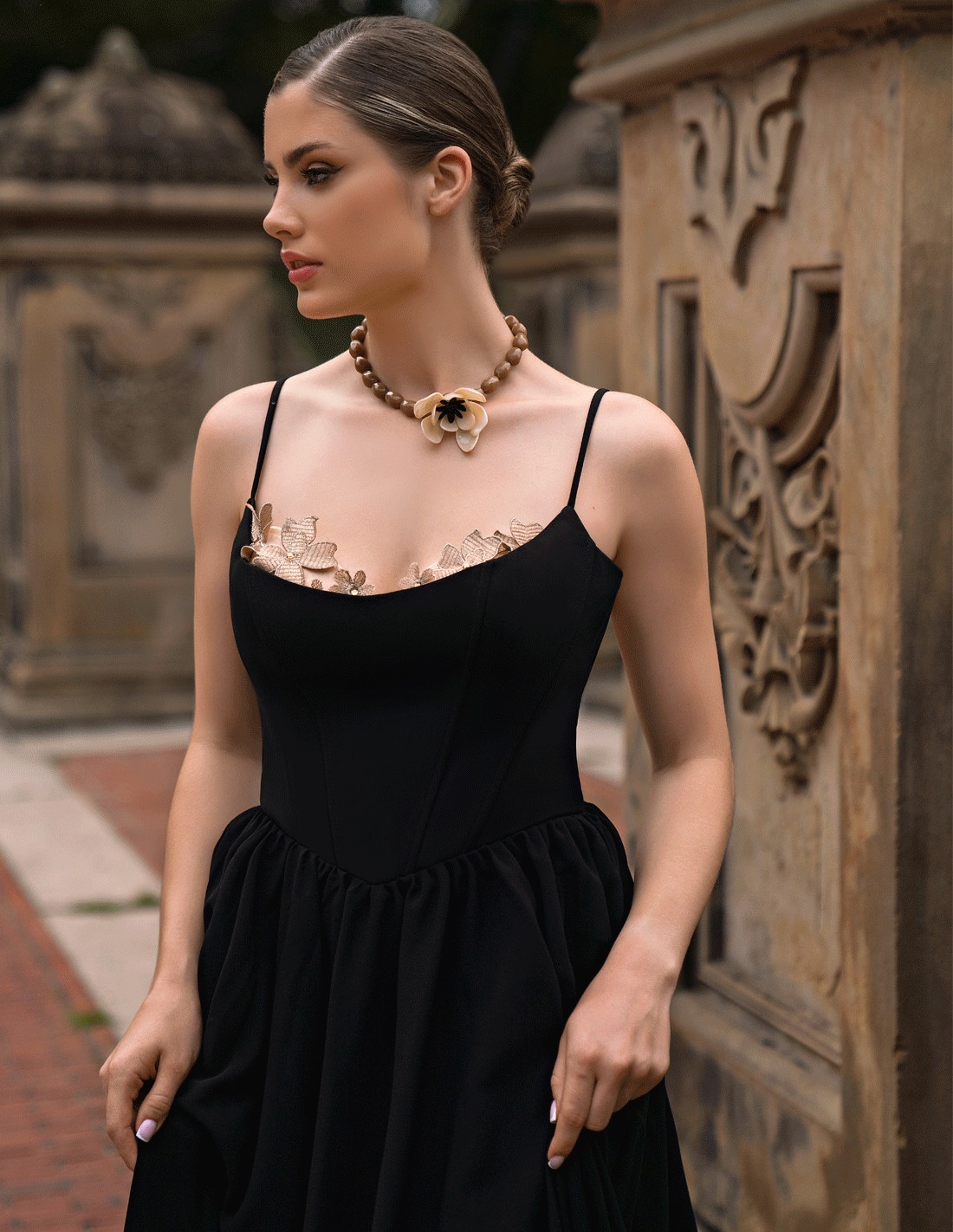 Robe de soirée longue avec encolure fleurie et corsage à effet corset