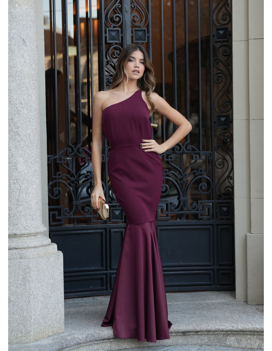 Longue robe sirène bordeaux avec encolure asymétrique et cape