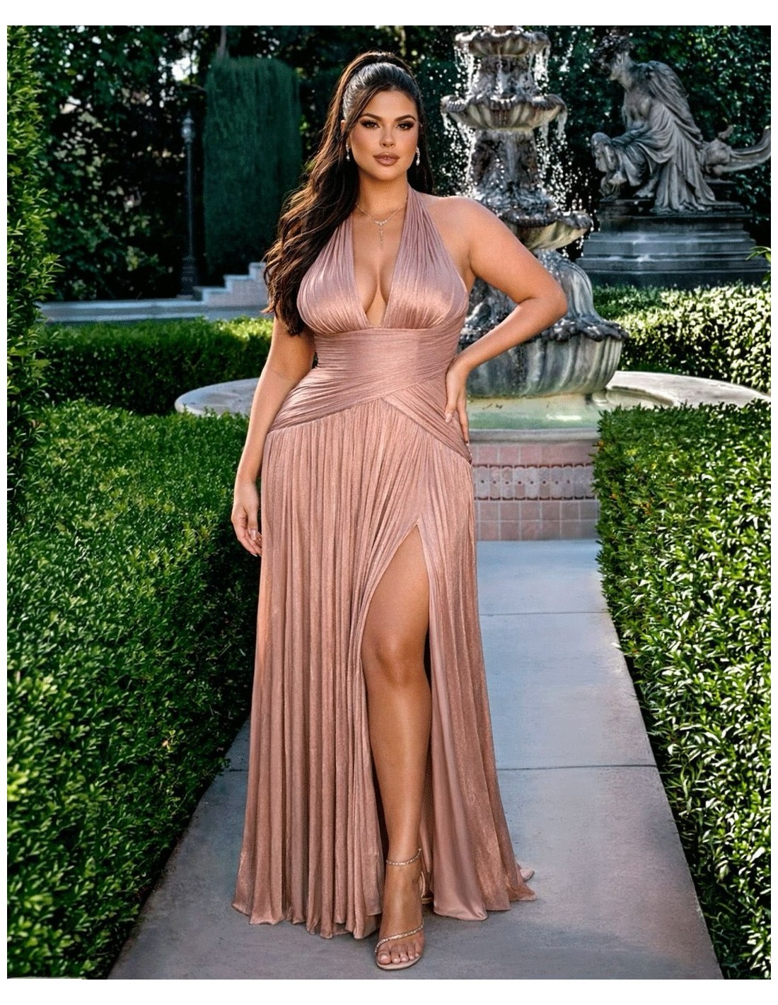 Cette longue robe d'invité est une pièce conçue pour briller d'élégance lors des événements les plus spéciaux. Confectionnée en mousseline de soie plissée aux délicats reflets métalliques, son tissu léger et aérien crée un effet sophistiqué. Le décolleté plongeant met en valeur l'encolure, tandis que le corsage plissé s'ajuste délicatement au corps, définissant la silhouette de manière flatteuse. La taille profonde affine la silhouette et laisse place à une jupe fluide et fendue, qui apporte du dynamisme sans perdre en élégance. Idéale pour les mariages en soirée, les galas ou les événements spéciaux.