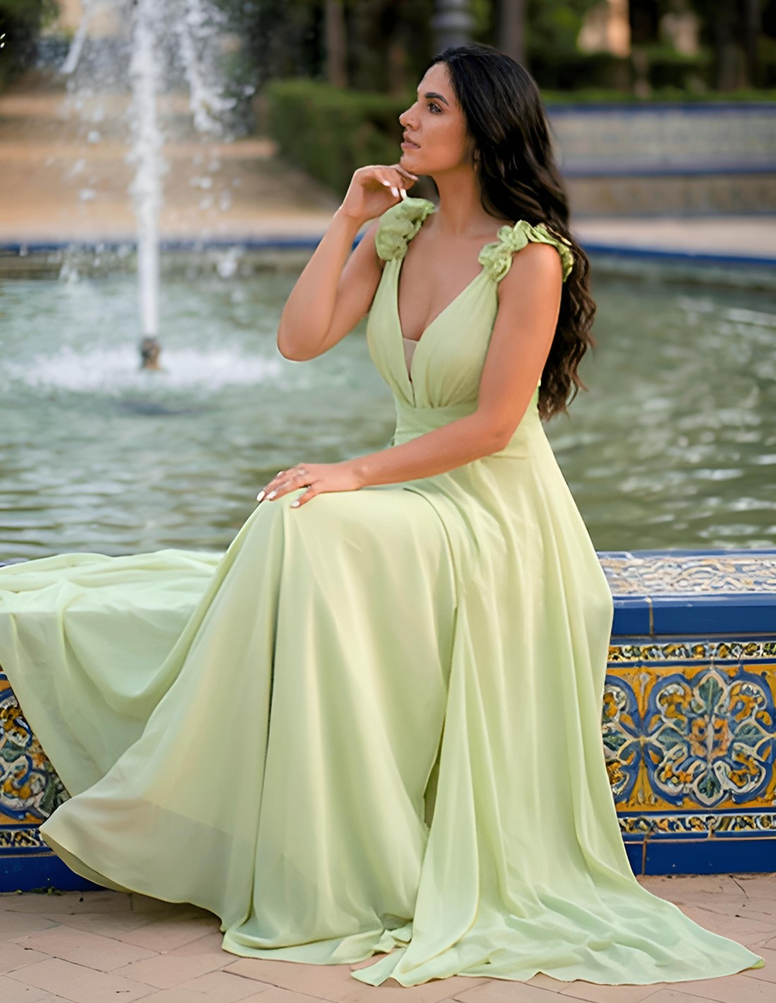 L'un des détails les plus particuliers est constitué par les bretelles ornées de fleurs dans le même tissu, qui encadrent délicatement les épaules et apportent une finition romantique et soignée. Le décolleté en V affine le torse et équilibre le dessin, ce qui fait de cette robe un choix parfait pour les mariages, les célébrations spéciales et les événements élégants.