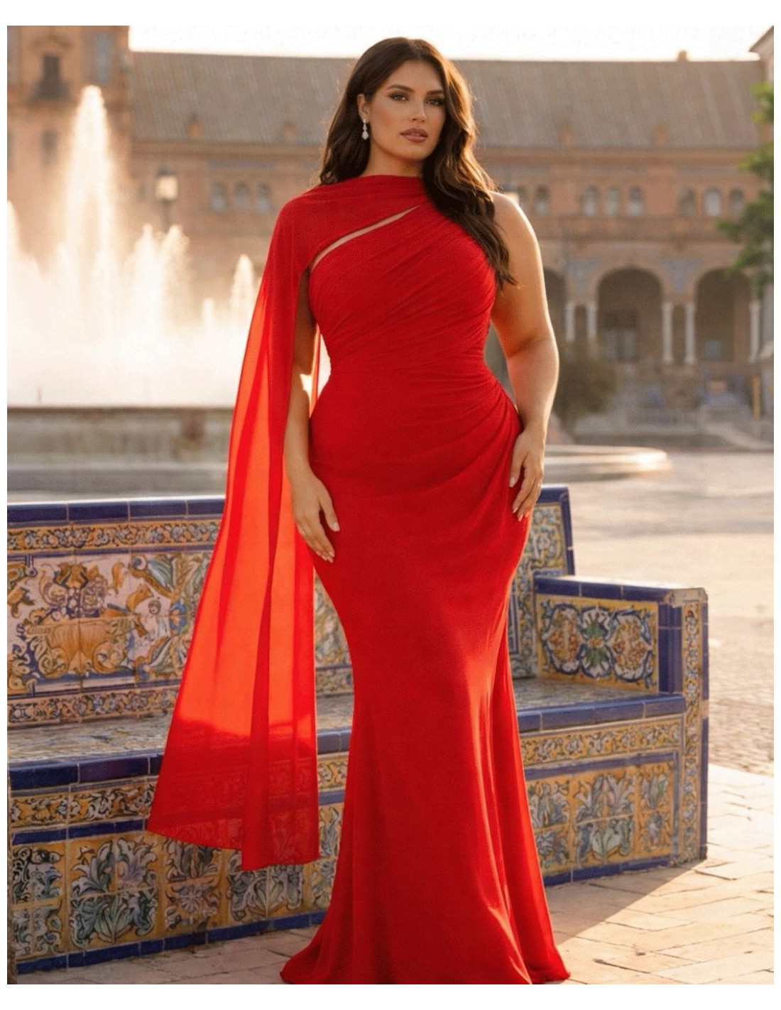 Cette longue robe rouge est conçue pour les invitées qui souhaitent se démarquer avec élégance et assurance. L'encolure asymétrique ajoute à la sophistication, tandis que le drapé du corsage affine et équilibre la silhouette.