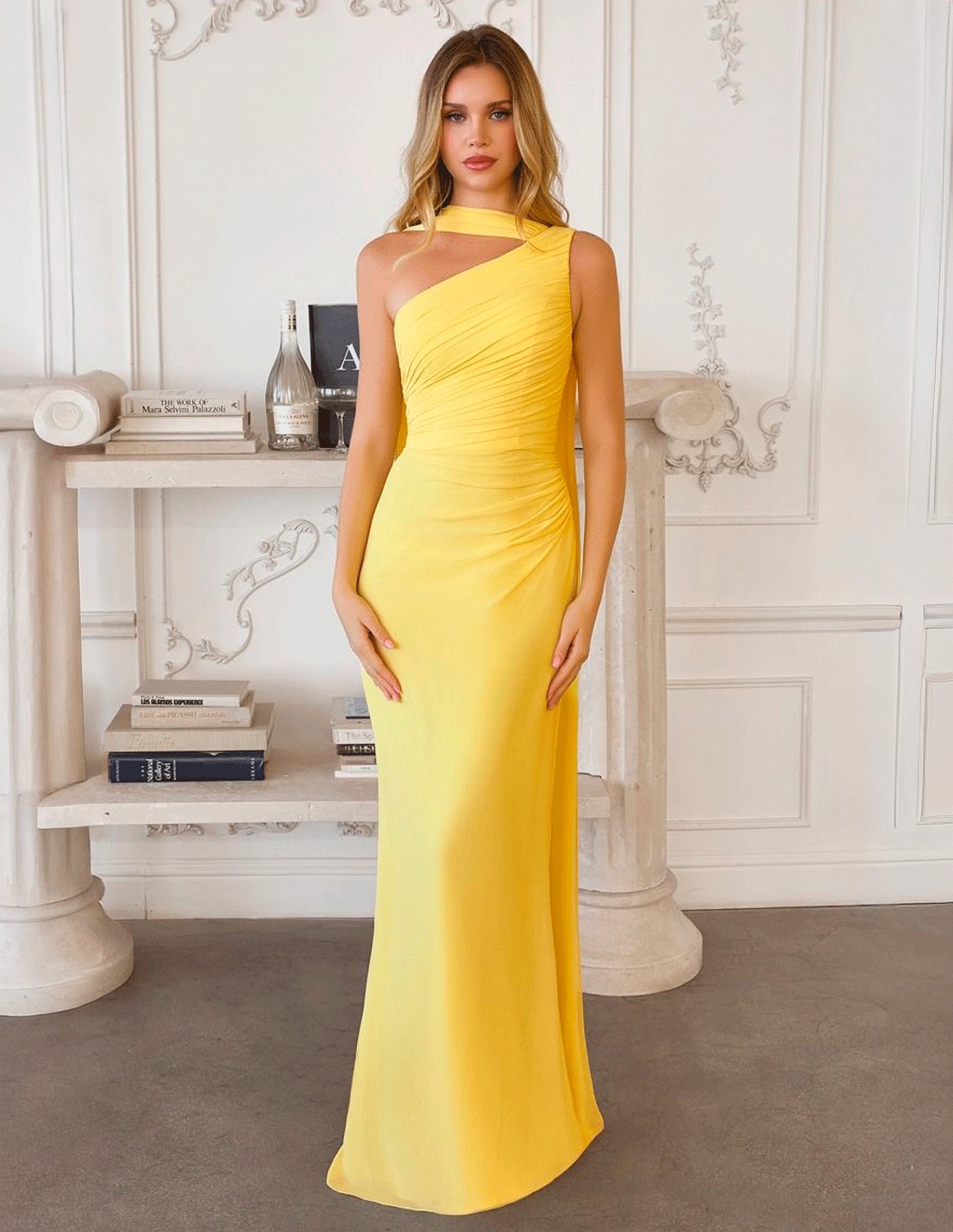 Cette robe longue de fête jaune pastel est un choix lumineux et délicat pour les invitées qui recherchent l'élégance sans artifice. Inspirée du style grec, son encolure asymétrique à une épaule lui confère un caractère sophistiqué et contemporain.