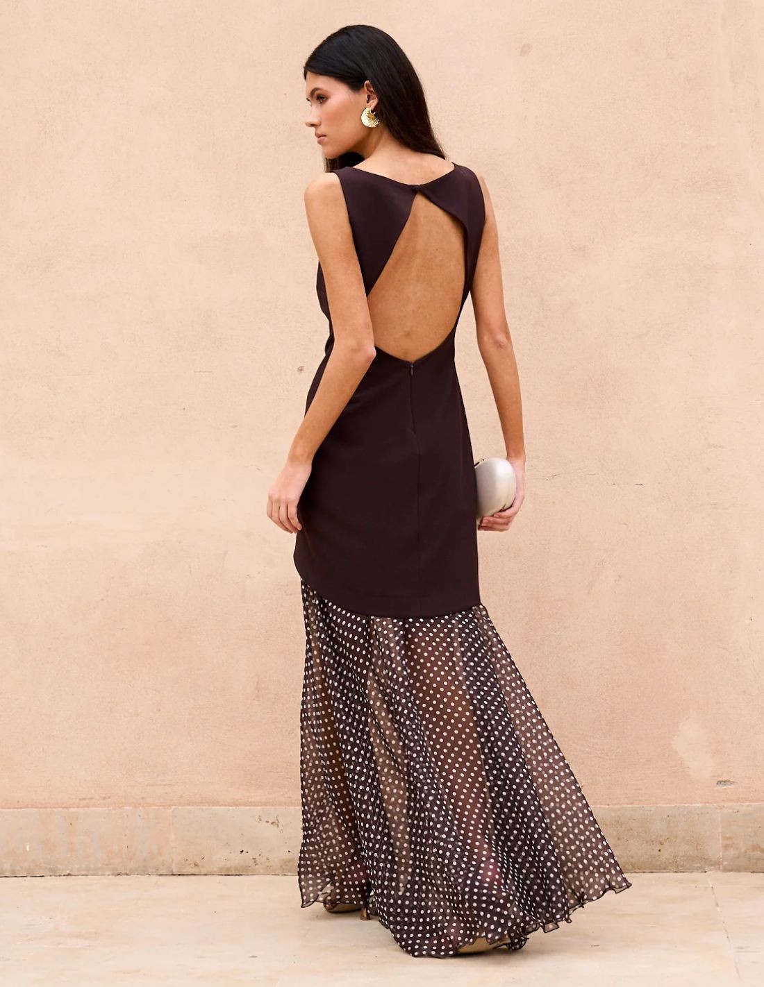Longue robe d'invité marron avec silhouette de sirène et jupe à pois