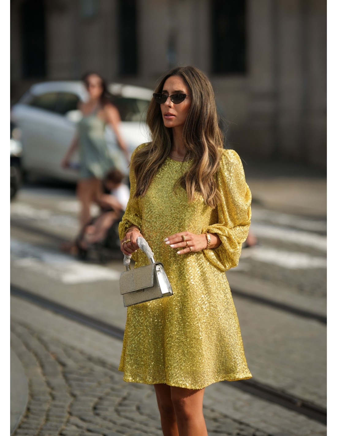 Si vous avez un événement à organiser cet automne/hiver, cette robe courte vous fera briller. Dotée de longues manches bouffantes et d'une coupe féminine et élégante, elle peut être portée lors d'événements diurnes. Réalisée avec des paillettes jaunes. Sans aucun doute, un modèle spécial et unique pour être la mieux habillée. Vous pouvez le porter plus sophistiqué pour des occasions plus formelles mais vous pouvez aussi le combiner avec des accessoires plus décontractés pour d'autres types de plans.