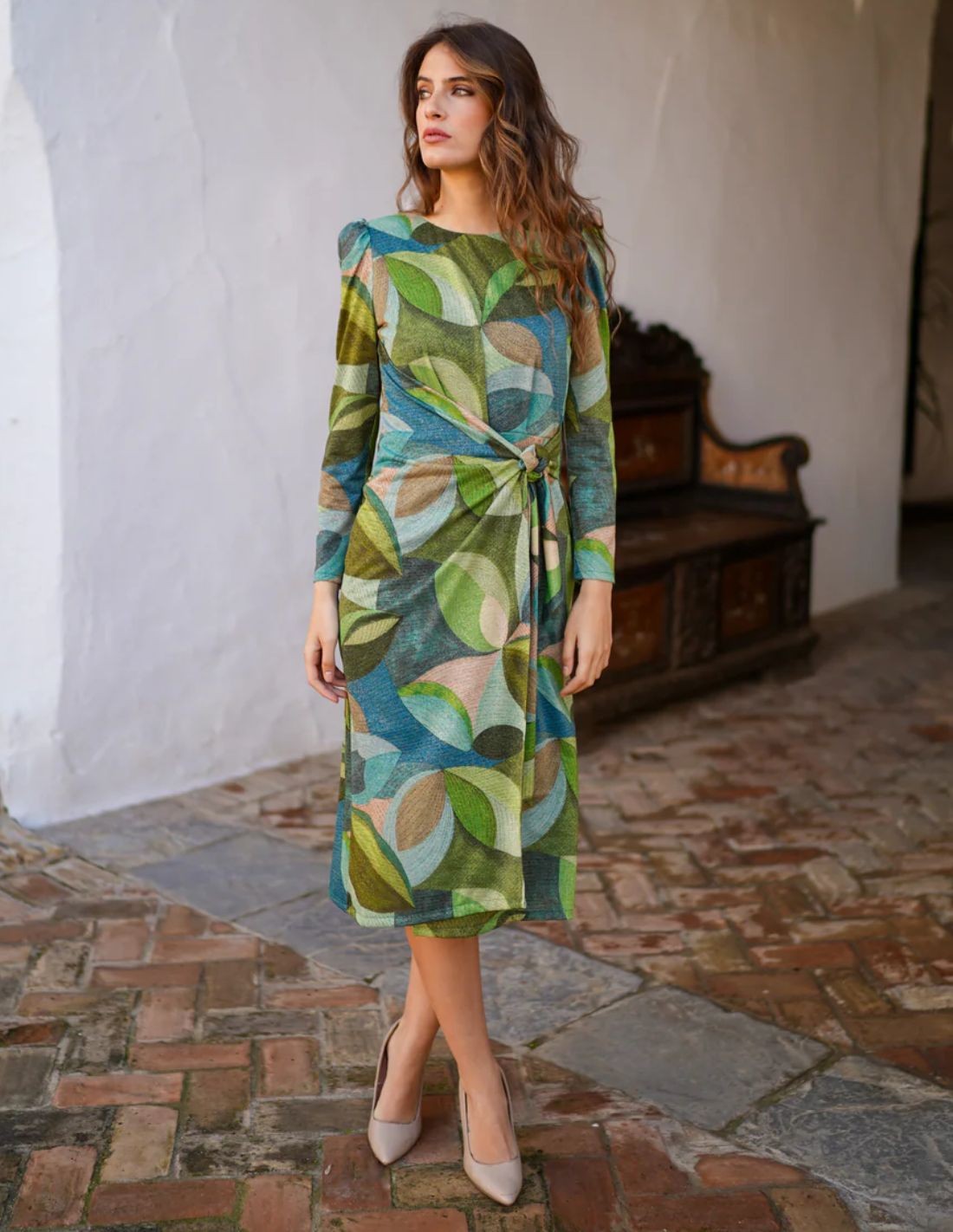 Robe de cocktail imprimée verte avec paillettes et manches longues