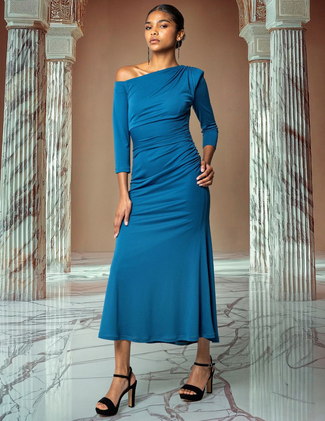 Cette robe midi en maille allie confort, style et sophistication en un seul modèle. L'encolure asymétrique apporte une touche moderne et élégante, tandis que les manches longues équilibrent la silhouette et en font un choix idéal pour les événements de mi-saison. Le corsage légèrement drapé met subtilement en valeur la silhouette, en ajoutant de la texture et du mouvement.