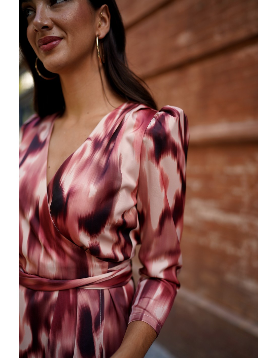 Robe midi croisée imprimée marron avec manches longues et ceinture
