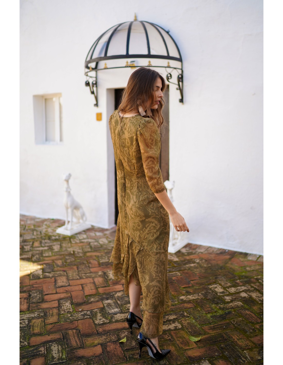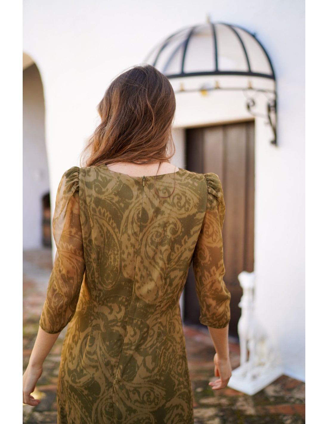 Cette robe midi vert olive à imprimé baroque est une pièce sophistiquée et polyvalente pour celles qui recherchent l'élégance et le confort en un seul modèle. Confectionnée dans un tissu léger et semi-transparent à la finition douce, elle est agréable au contact de la peau et parfaite pour être portée tout au long de la journée ou lors d'événements spéciaux.