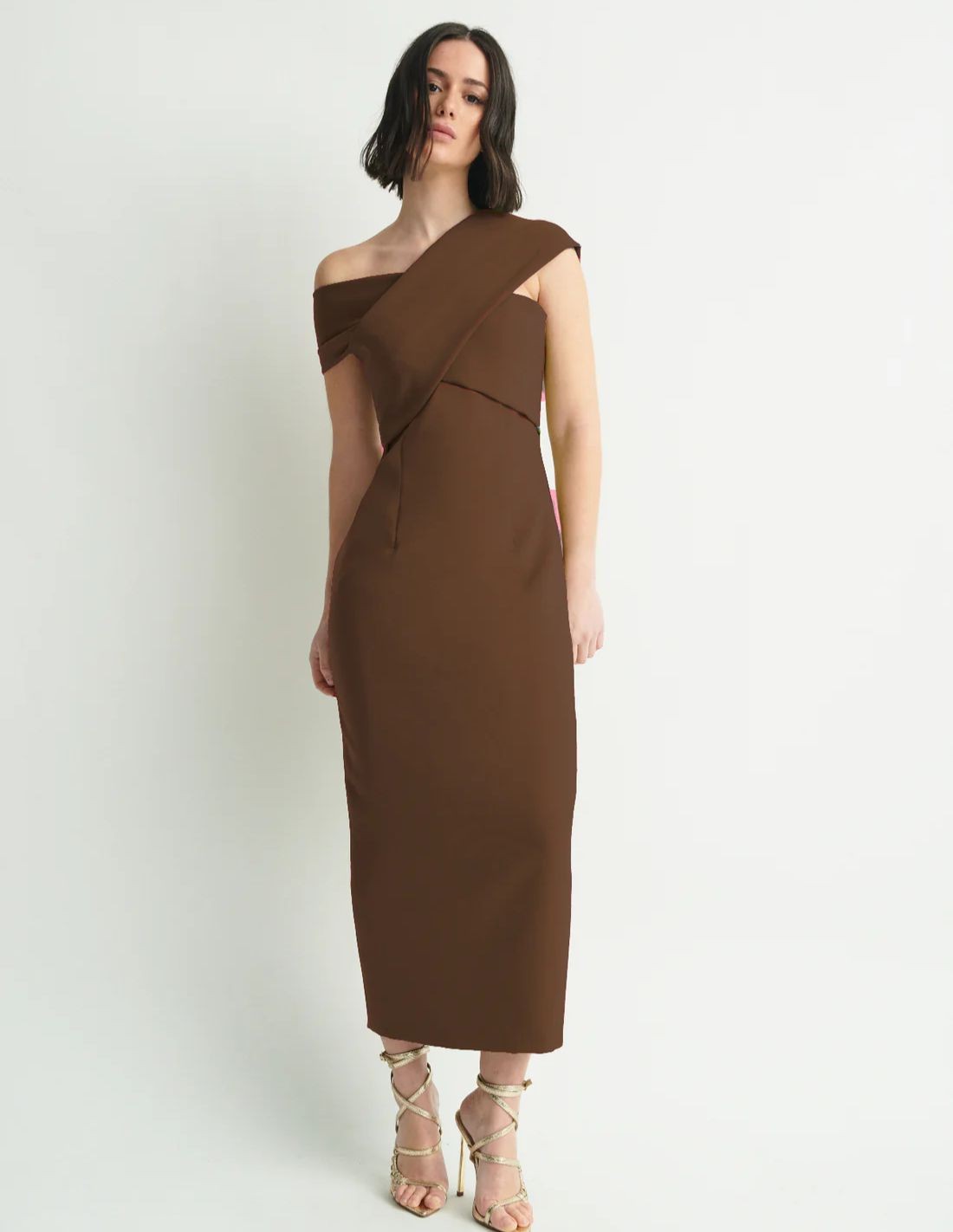 Cette robe midi marron est la combinaison parfaite de la sophistication et du minimalisme. Son encolure croisée asymétrique lui confère un design moderne et élégant, mettant en valeur la zone du décolleté avec un effet enveloppant flatteur. La silhouette crayon affine la silhouette et s'adapte au corps avec un drapé impeccable, créant un look raffiné et intemporel. Idéale pour les événements, les invités ou les occasions spéciales où l'on recherche une élégance discrète avec une touche contemporaine.