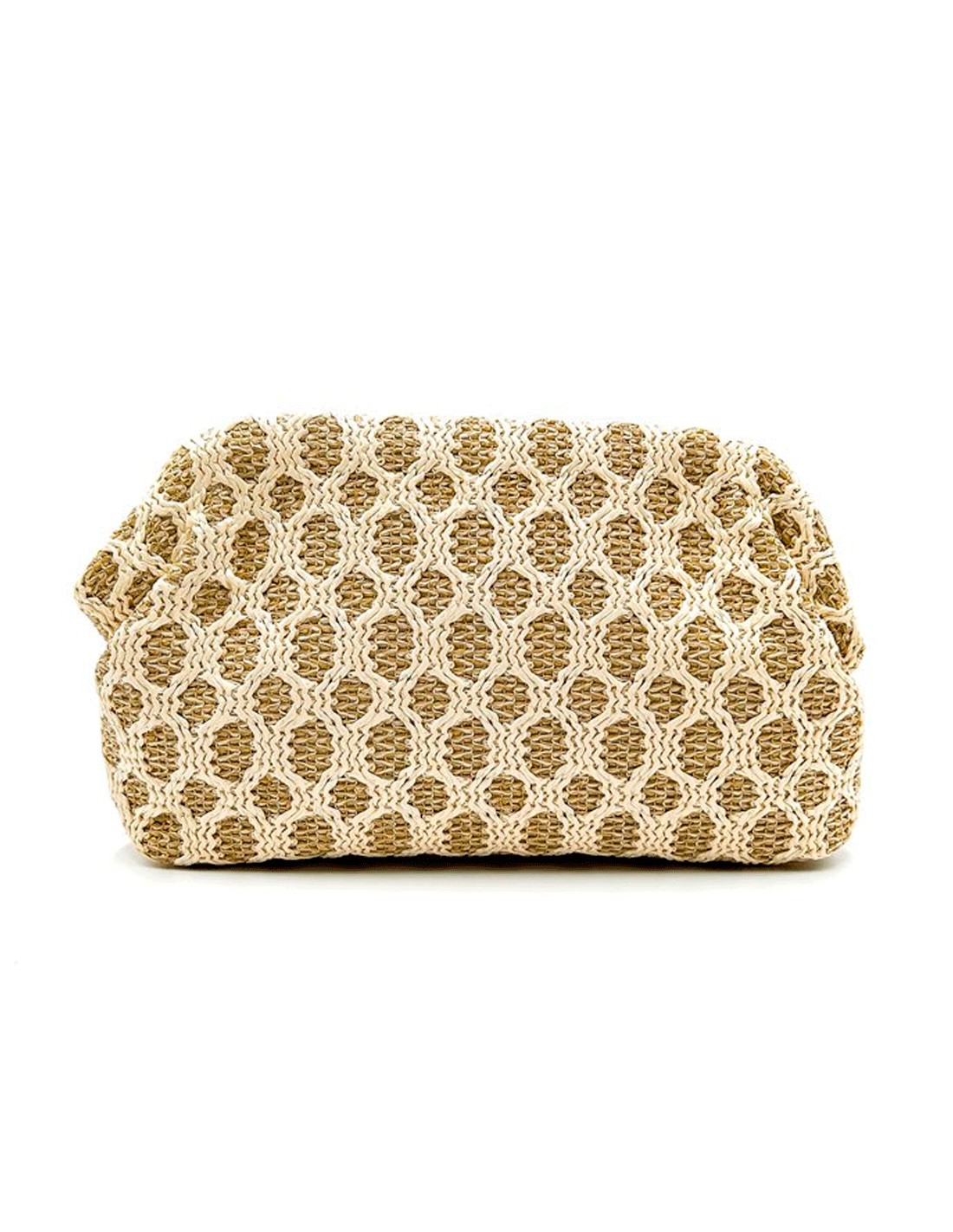 Pochette en raphia à motif ajouré dans les tons beige et camel. Elégante, légère et parfaite pour les mariages de jour.