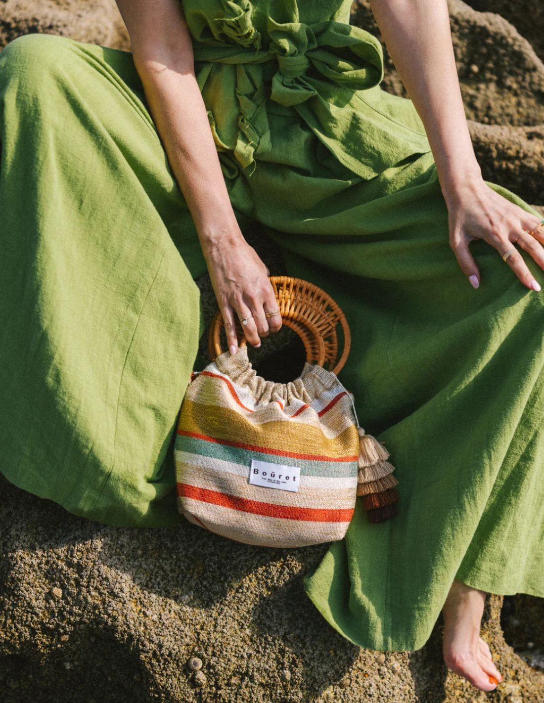 Unsac en tissu de type tapisserie au motif rayé multicolore qui apporte une touche artisanale et contemporaine. Ses anses rigides en rotin ajoutent une touche naturelle et distinctive, créant une pièce unique avec de la personnalité.
