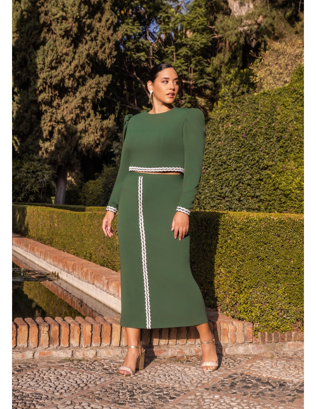 Vos événements d'automne/hiver méritent un look à la hauteur. Cette tenue d' invité vous fera briller. Composée d'un top à encolure fermée et manches longues et d'une jupe midi. Les deux sont ornés de détails de passementerie qui donnent une touche élégante et originale à l'ensemble. Vous pouvez la porter aussi bien en journée qu'en soirée et la combiner ensemble ou séparément. Sans aucun doute, vous serez une invitée parfaite !