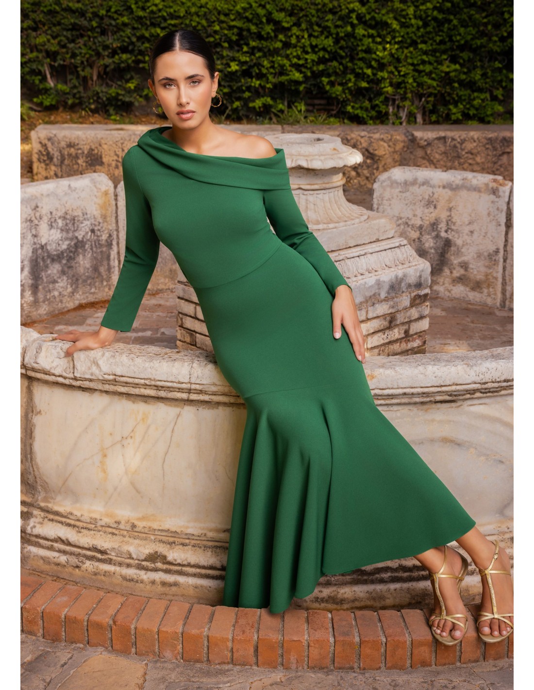 Pour cette saison automne/hiver, cette tenue d'invité midi vous fera briller ! Elle se compose d'une encolure asymétrique et de manches longues. La jupe midi à volants vous permettra de bouger et vous donnera une touche sophistiquée pour votre occasion spéciale. Vous pouvez choisir entre le vert ou le carrelage pour l'associer à vos accessoires préférés. Réalisée en crêpe, elle est confortable et élégante pour les mariages, les communions, les remises de diplômes...