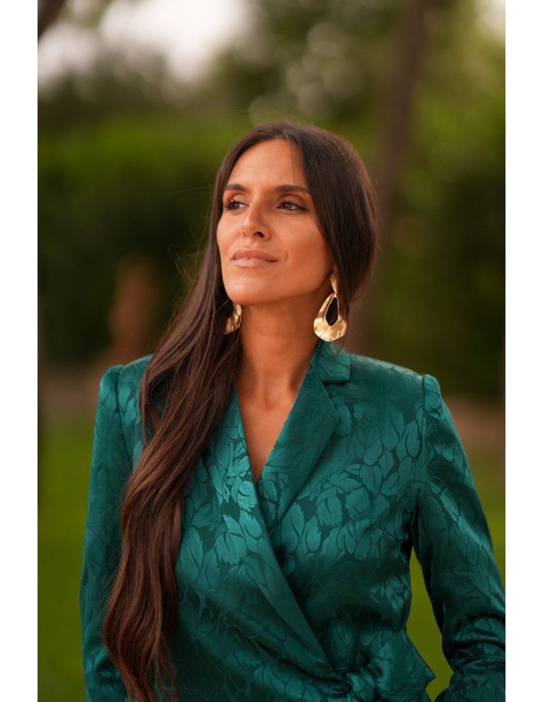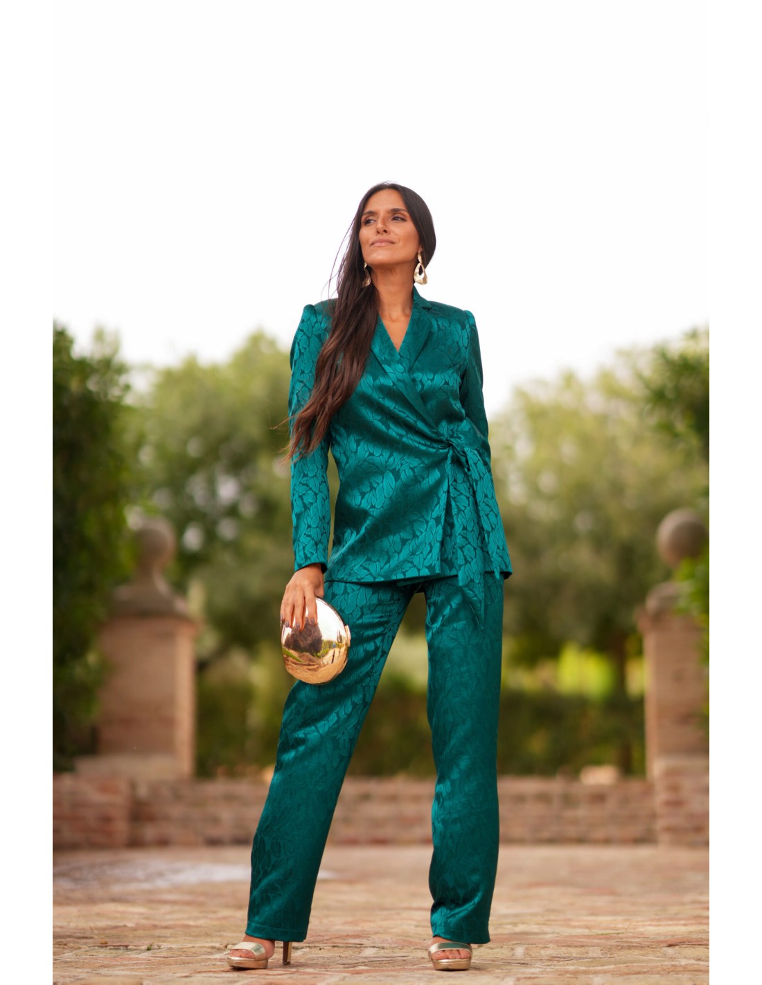 Cet ensemble veste et pantalon en satin est un choix sophistiqué et moderne pour les occasions spéciales. La veste, à la coupe croisée et à l'encolure en V, est élégamment taillée avec un lien sur le côté, ce qui met en valeur la silhouette féminine. Le pantalon à coupe droite, en satin doux et brocart vert, apporte une finition raffinée et flatteuse.