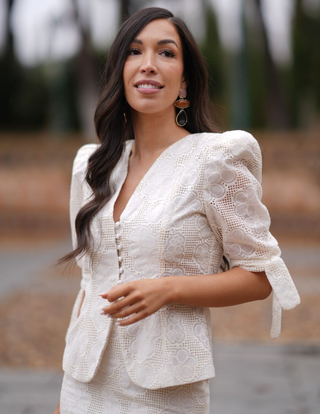 Optez pour un ensemble deux pièces pour votre prochain événement si vous voulez être confortable et élégante et que vous êtes une mère de communion, de baptême ou de mariée civile. Ensemble composé d'une veste à demi-manches avec boutons et décolleté en V, accompagnée d'une jupe midi de style crayon, en tissu perforé blanc. Idéal à combiner avec des accessoires dorés ou beiges.