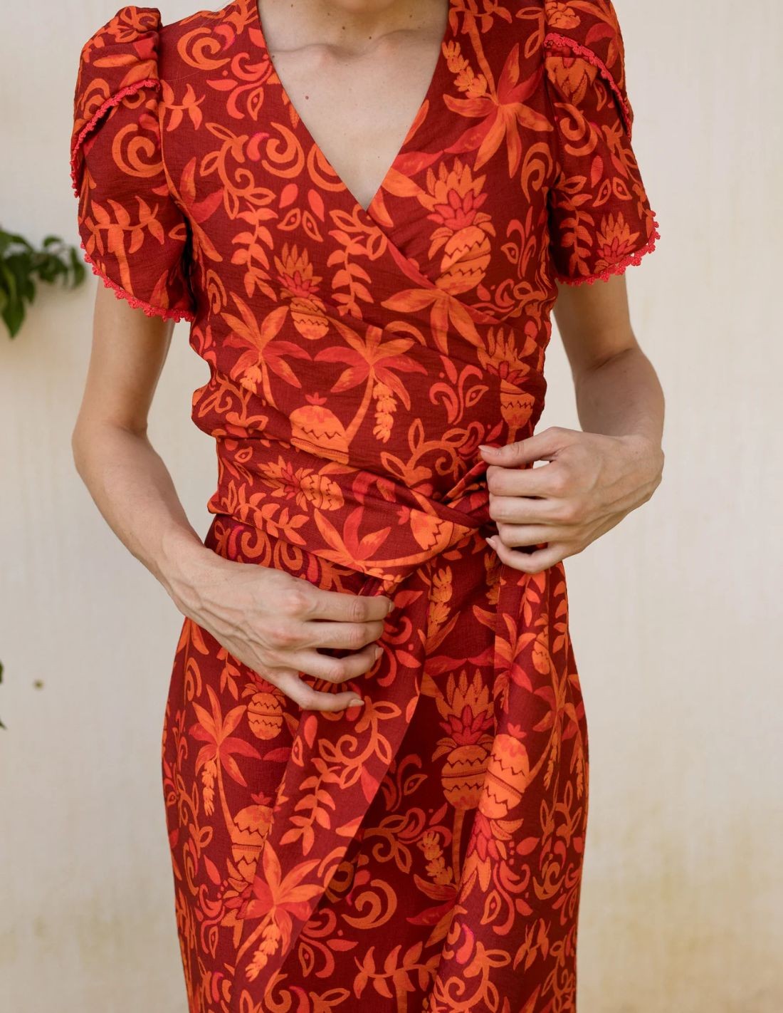 - Imprimé floral orange en lin avec détails rouges