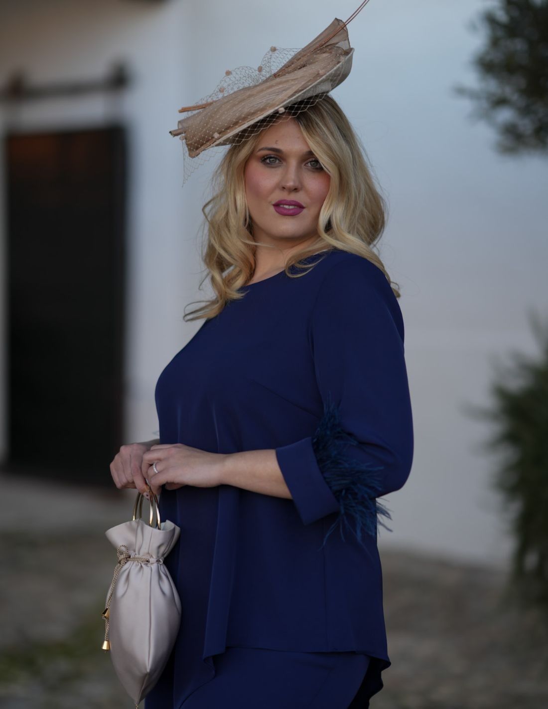 Si vous voulez avoir l'air spectaculaire mais que vous n'avez pas envie de porter une robe, cette tenue d'invité vous fera briller. Elle se compose d'un chemisier fluide avec des manches françaises et des plumes sur les poignets. Sur l'encolure, un détail en forme de goutte d'eau, subtil et élégant. En bas, un pantalon à la ligne droite, très flatteur. Les deux pièces sont de couleur marine, élégantes et sophistiquées, et peuvent être portées en toute saison. Idéal pour un mariage, une communion, un baptême...